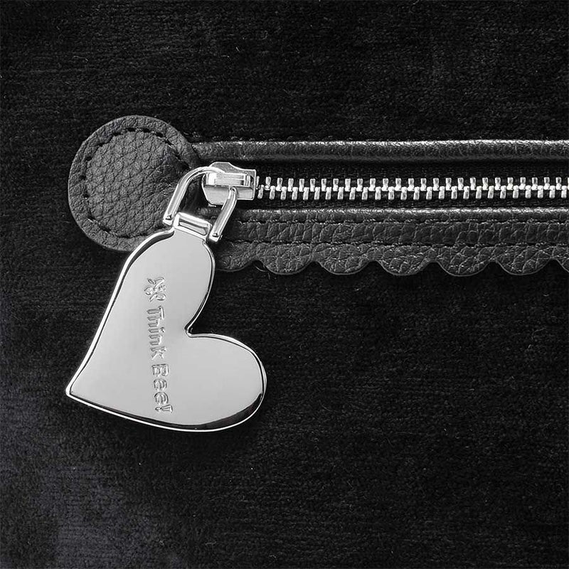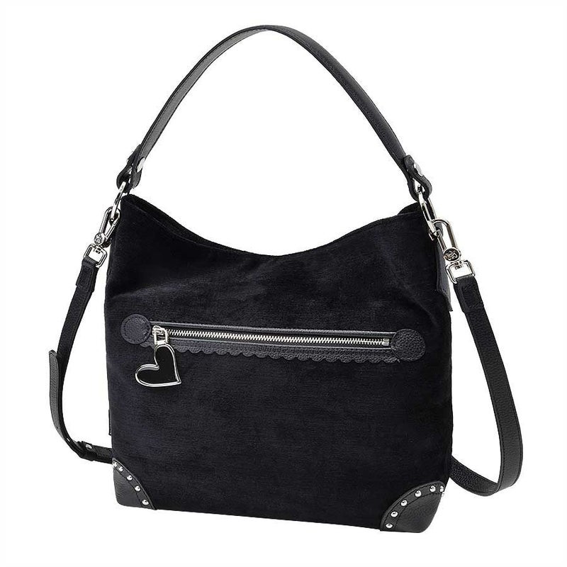 背面には小物の収納に便利なファスナーポケット付きで、ハート型の引き手は表がブラック、裏はシルバーの刻印入り。