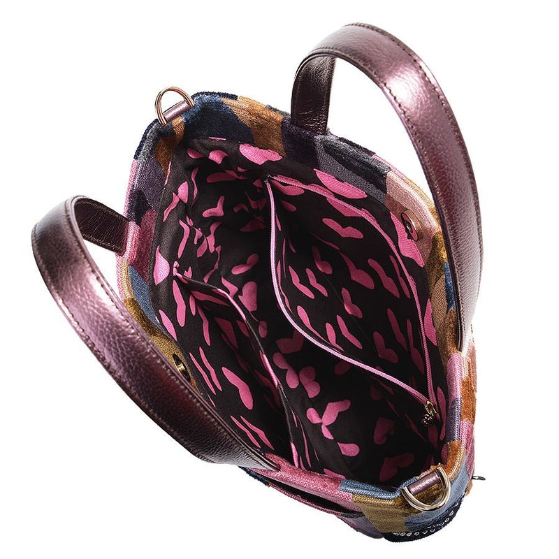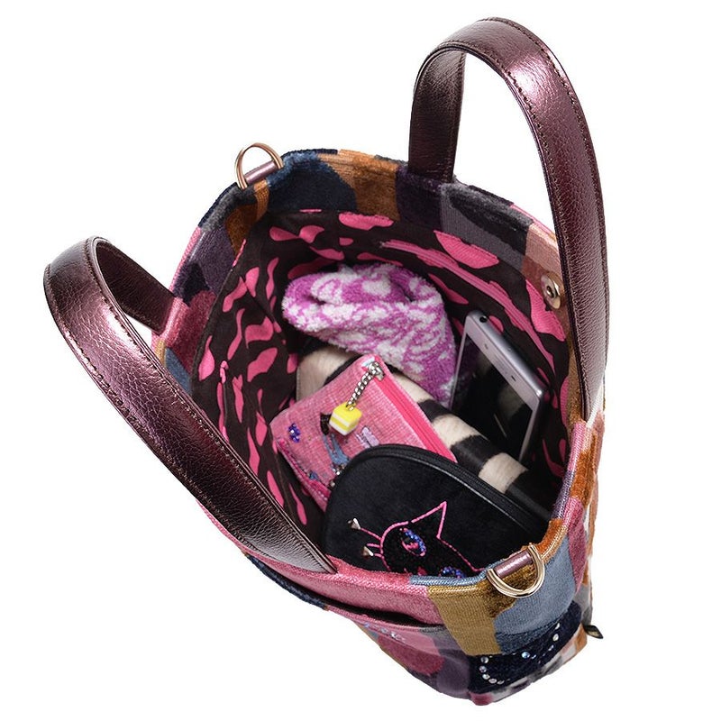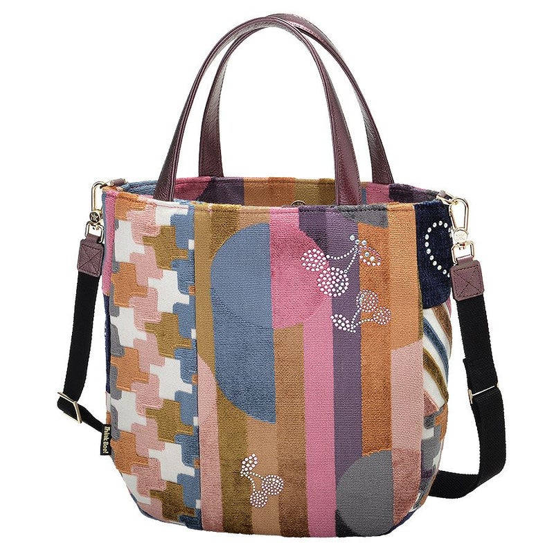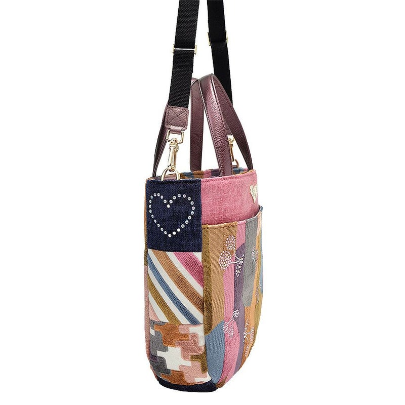 丸みを帯びたシルエットが優しい印象のトートバッグに。サイド・底面にも遊び心でポップにパッチワーク。360度どこから見ても、心ときめくキュートな作品です。