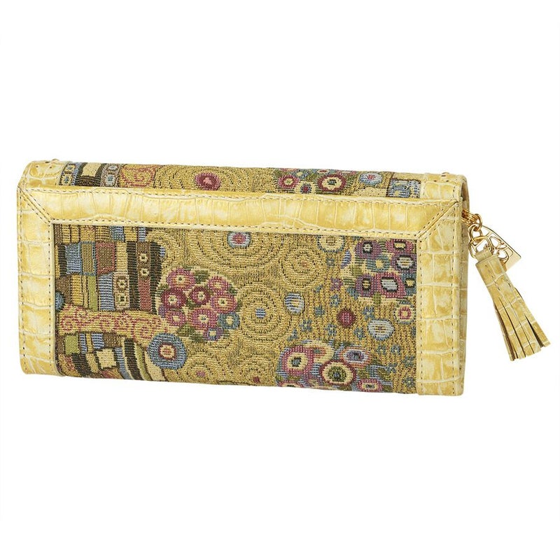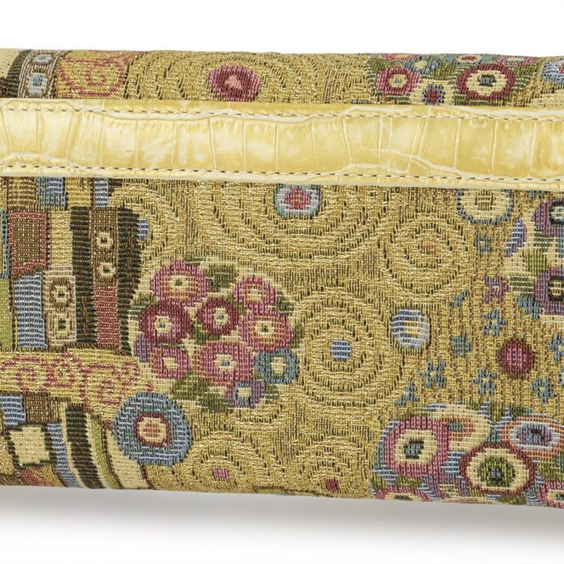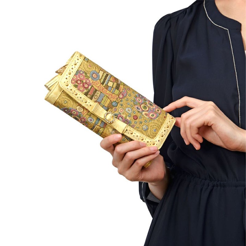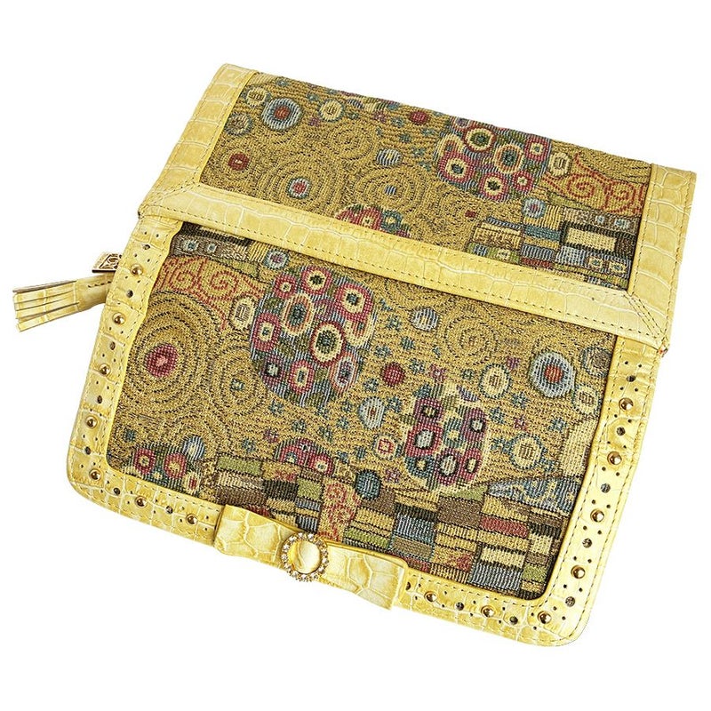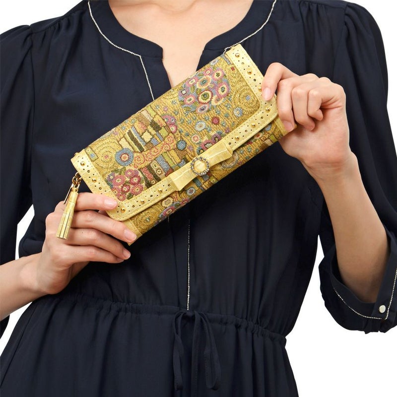 表地はイタリア製でゴールドを基調に緻密に織り上げられた幾何学模様は、19世紀末オーストリアの画家グスタフ・クリムトの絵画をもとに現代風にアレンジしたもの。