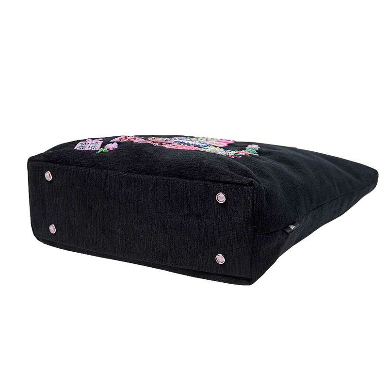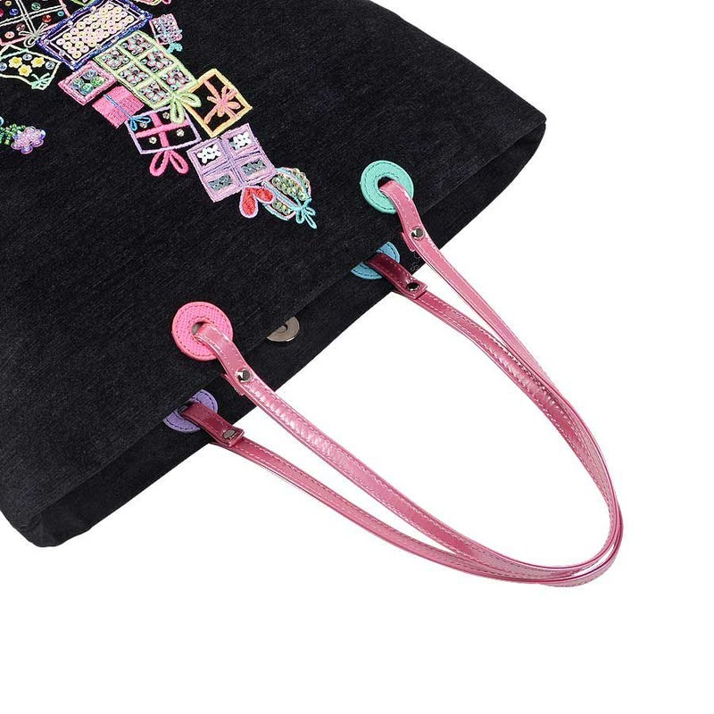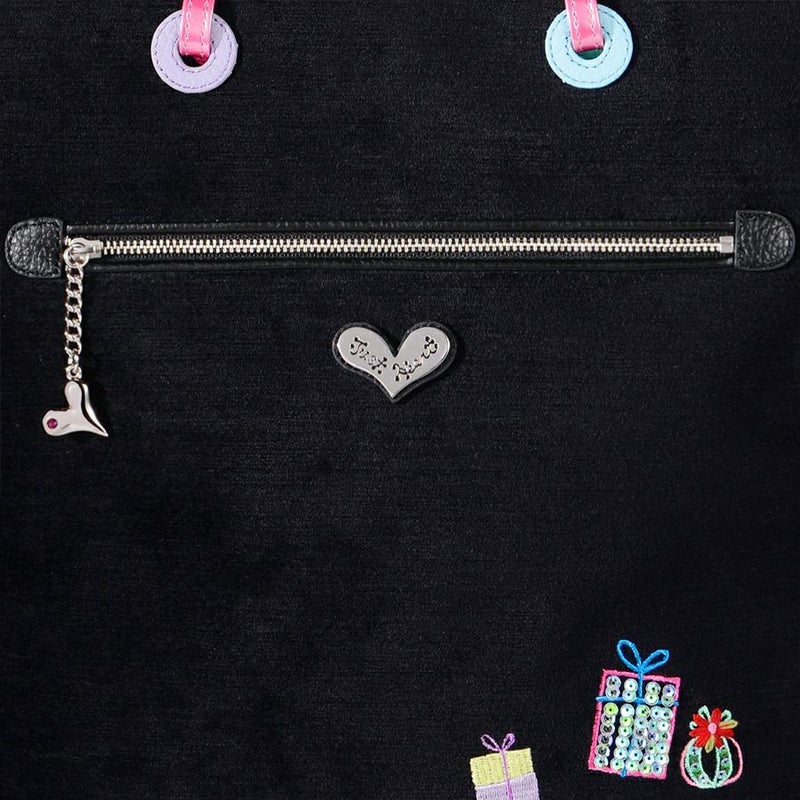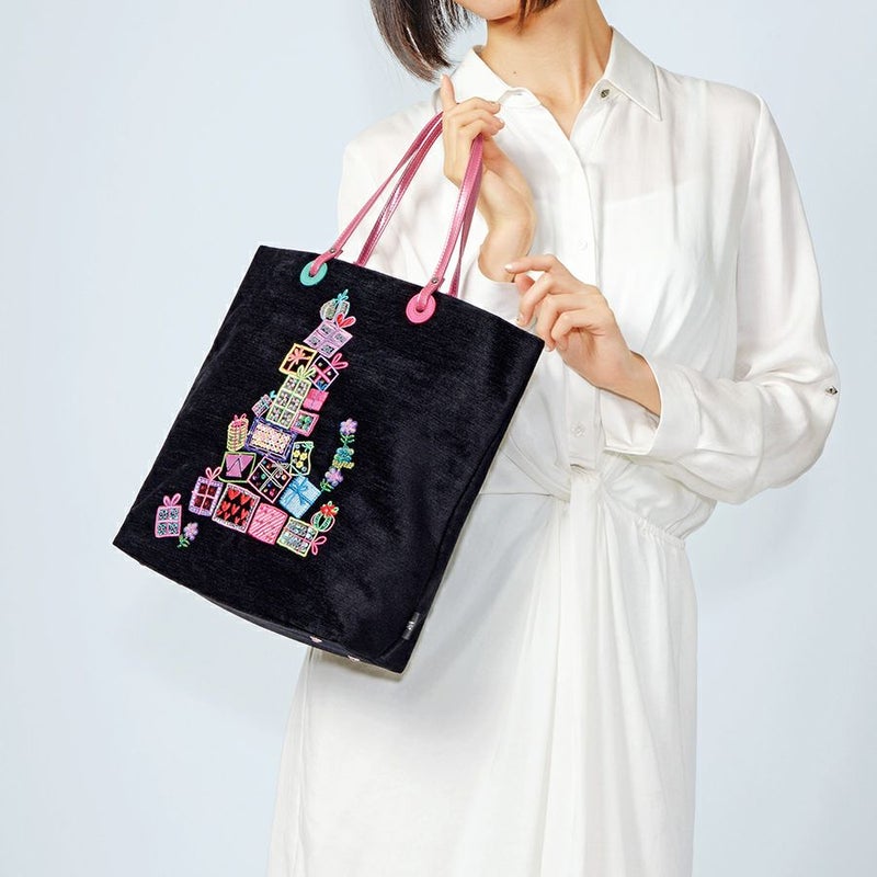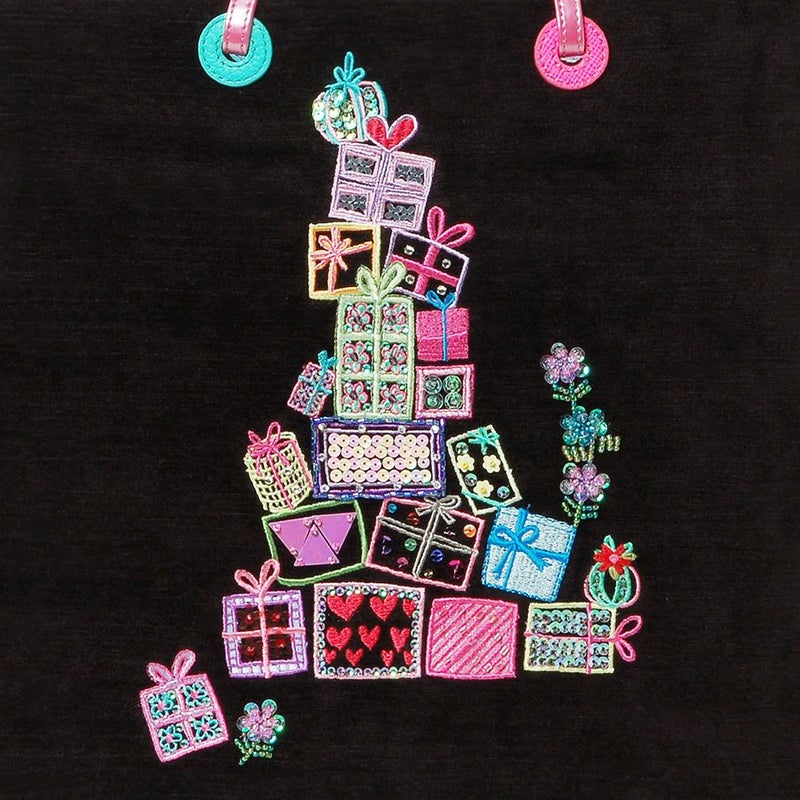 艶感のあるトルコ製のブラック起毛生地に、細いタッチのミシン刺繍でたくさんのプレゼントを描き、その上からビーズ、スパンコール刺繍を贅沢に施し、Swarovski Crystalsも使用して華やかさをプラス。