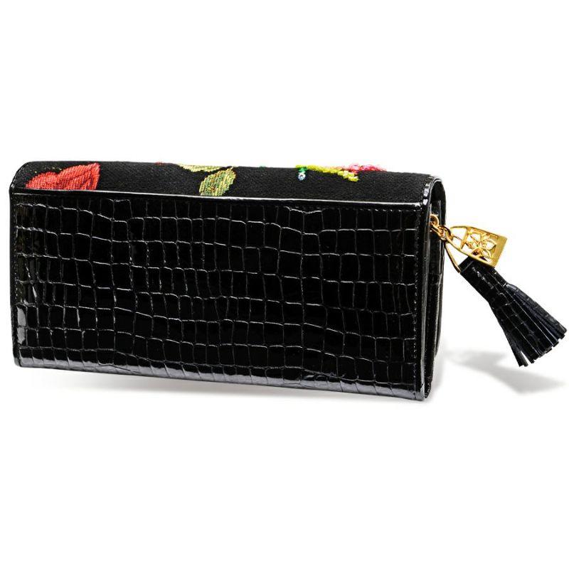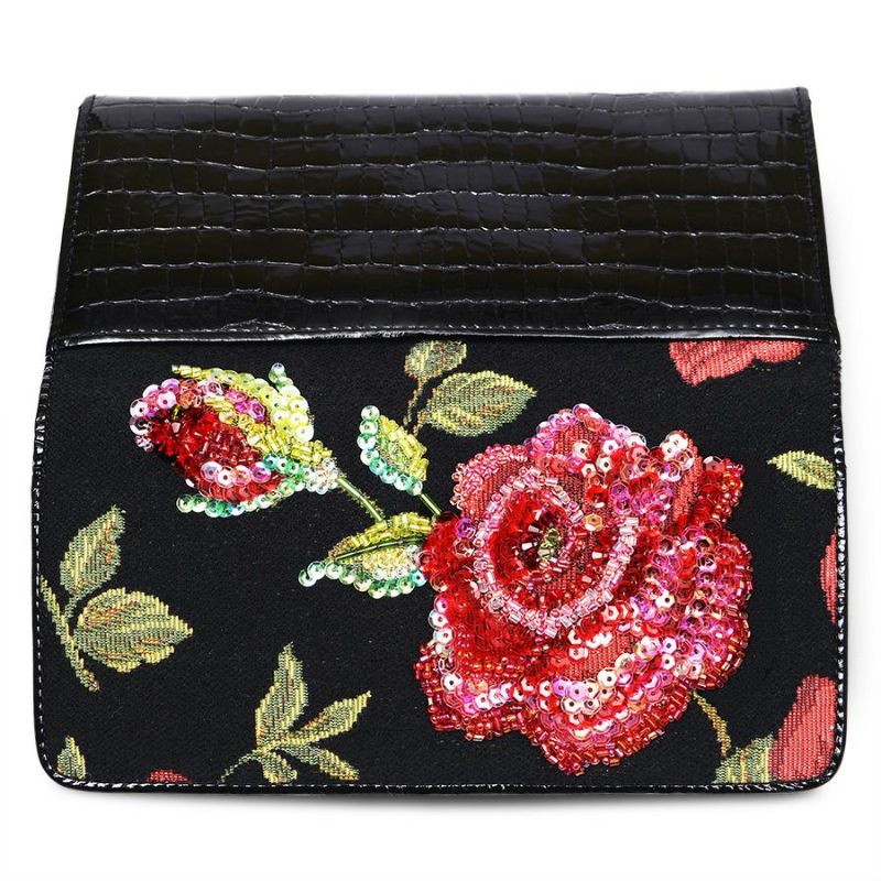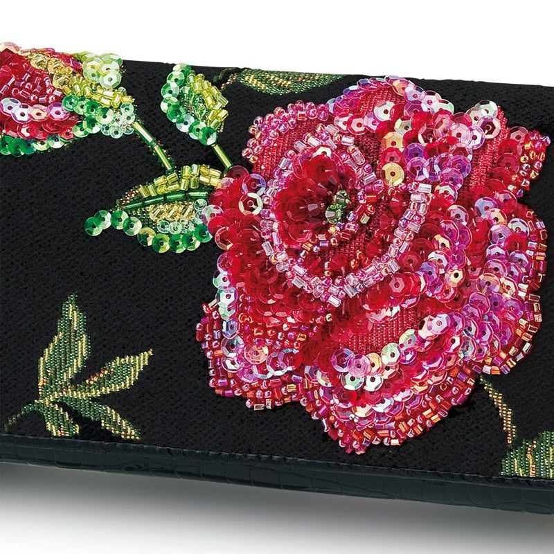 背面はクロコの型押しを施したエナメルの牛革。上品な光沢がエレガントな薔薇にマッチしてより華やかに。