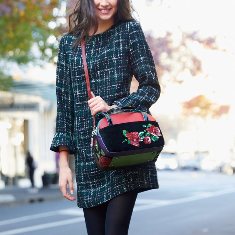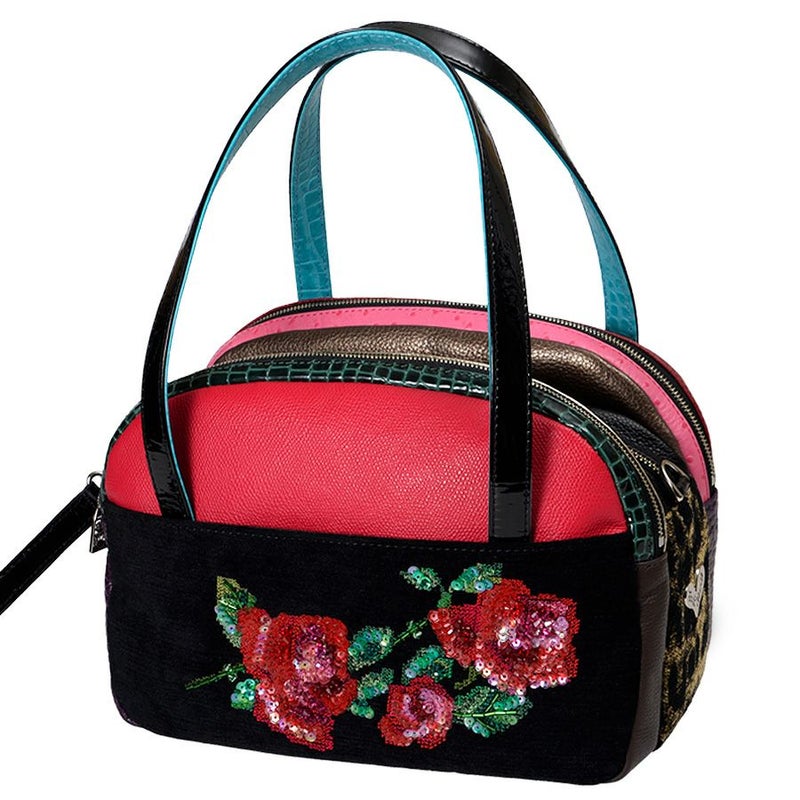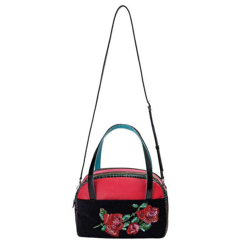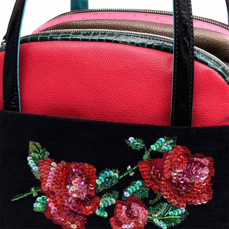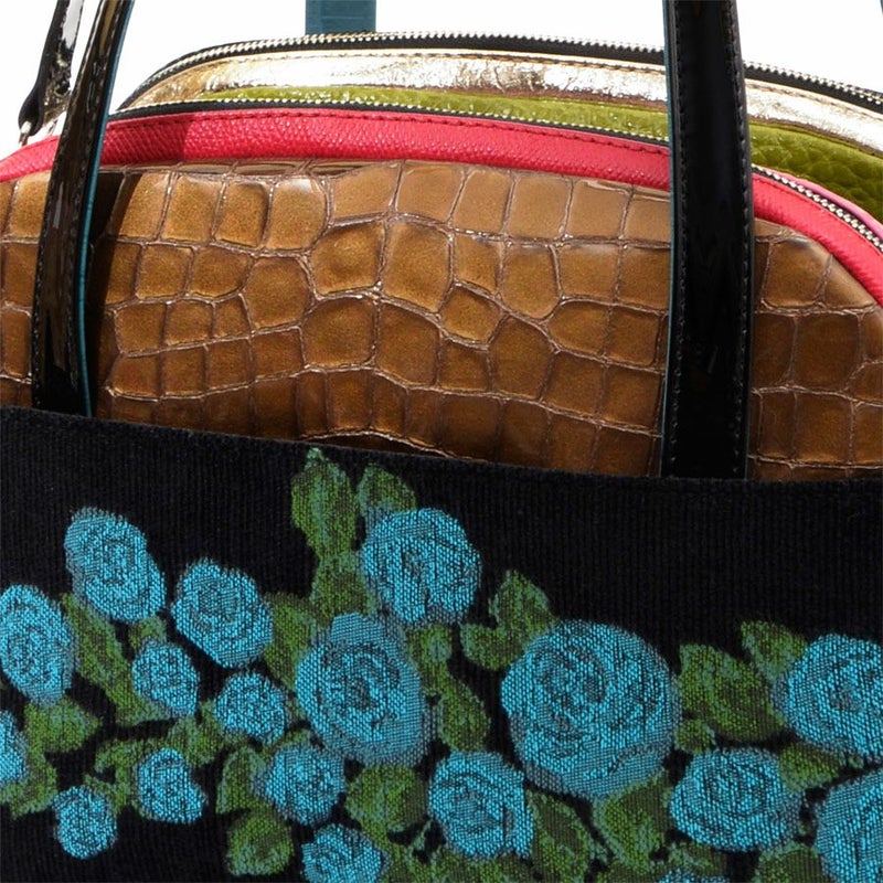前面の漆黒に浮かび上がるインパクトのある薔薇は、クロス・ステッチで表現した温かみのある表情が魅力。