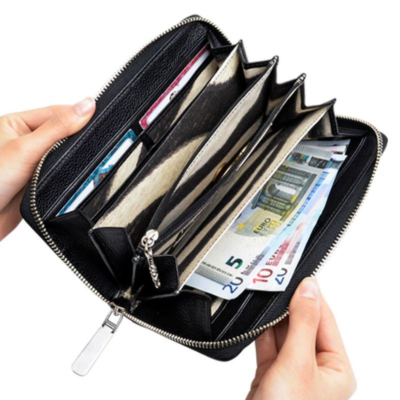 中央のファスナー式小銭入れを挟んで、札入れやカード入れをシンメトリーに配置しました。ポケット類が充実しているので、財布の中身をすっきりとまとめることができます。