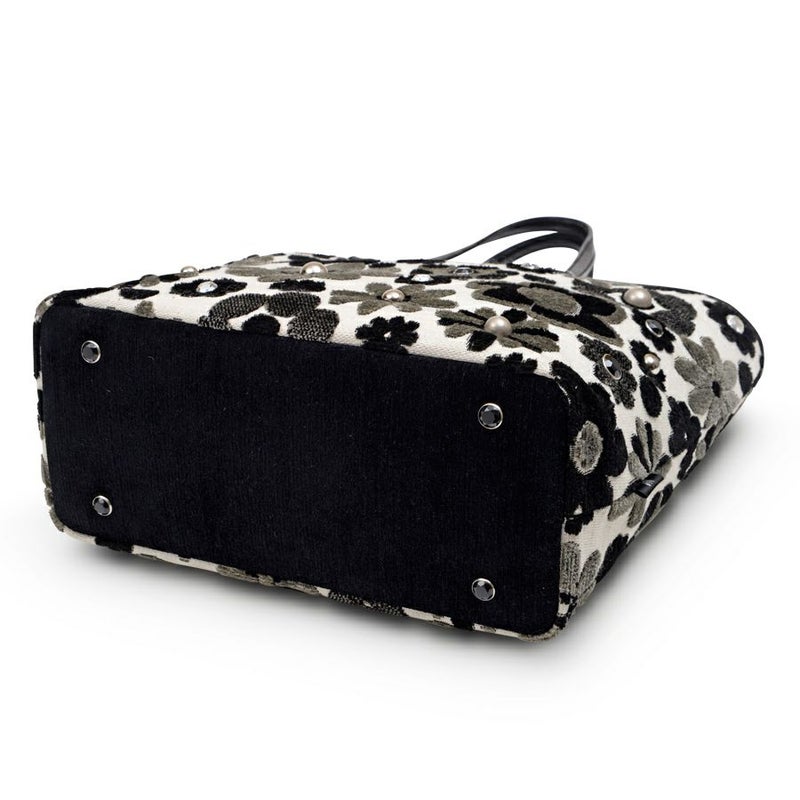 表地はパイルを凹凸に織り込んで柄を表現しているベルギー製の織物で、ふわふわとした手触りが特長。モノトーンで織り出されたマーガレットの中心に、ラインストーンやスタッズをあしらってさりげないアクセントに。