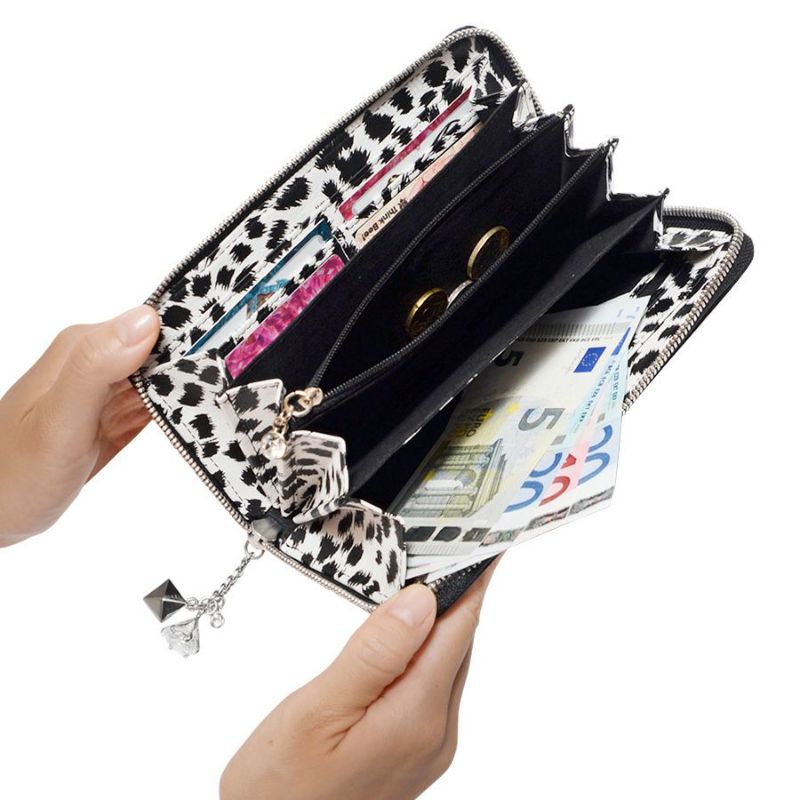 ラウンドファスナーを開けると、内装はモノトーンのレオパード! 柄をプリントした牛革を使ってサプライズを演出。