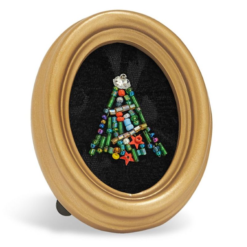 小さいながらも、モミの木の上で輝くトップスターや金色のモール、オーナメントの数々もビーズで表現されています。