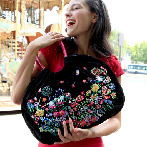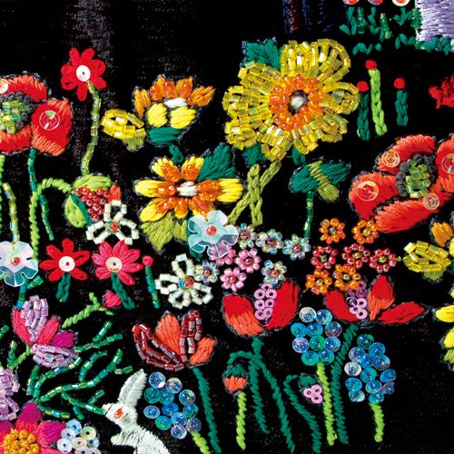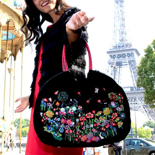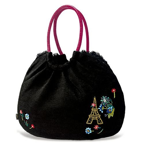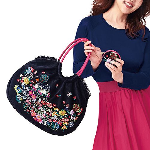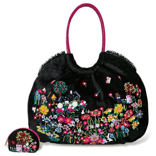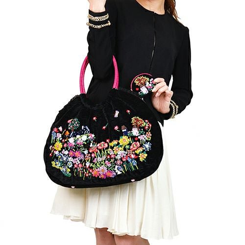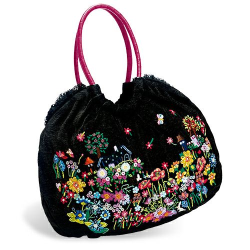 光沢感が美しいブラックの織生地に、色鮮やかに咲き乱れる花々や家並み。蝶やウサギが遊ぶ、のどかな田園風景をぬくもりのある手刺繍で描いたシリーズ。