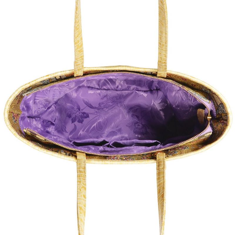 ファスナーのラベンダー色や、裏地に配したバイオレットの花柄ジャカード織生地がゴールドとの配色美を生み出しています。