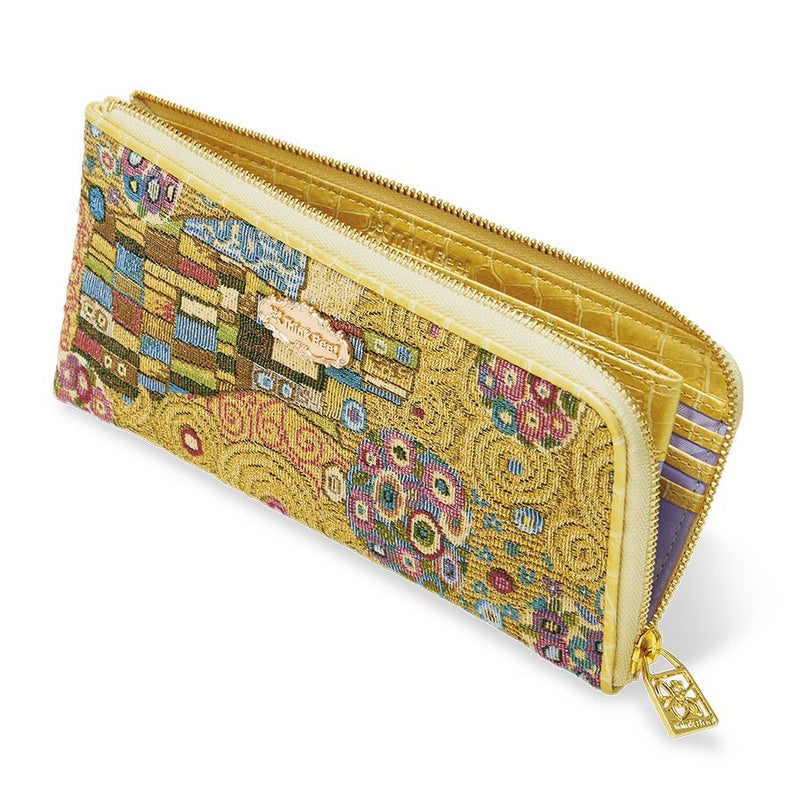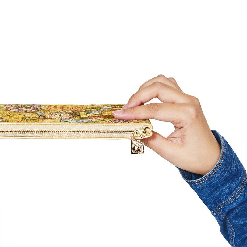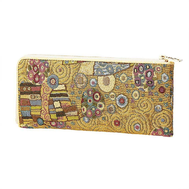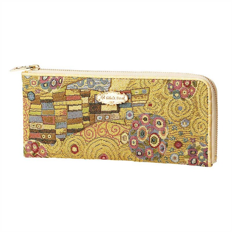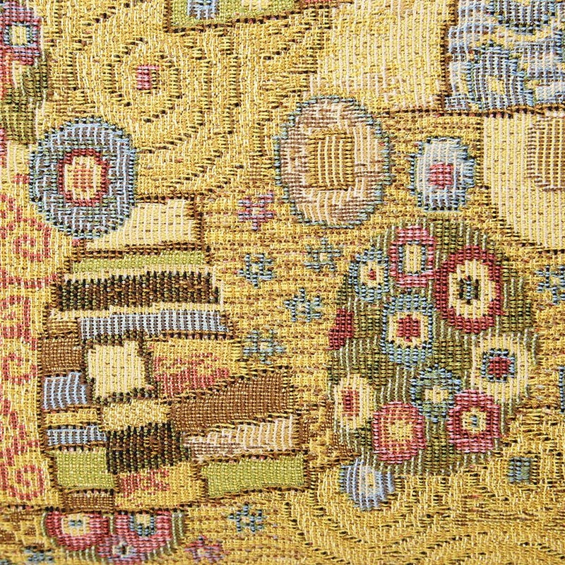日本美術の影響を受けたともいわれるクリムト絵画の華麗な装飾部分を再現した織物は、ヨーロッパ的な絢爛美の中にどこか親しみを感じるデザインです。