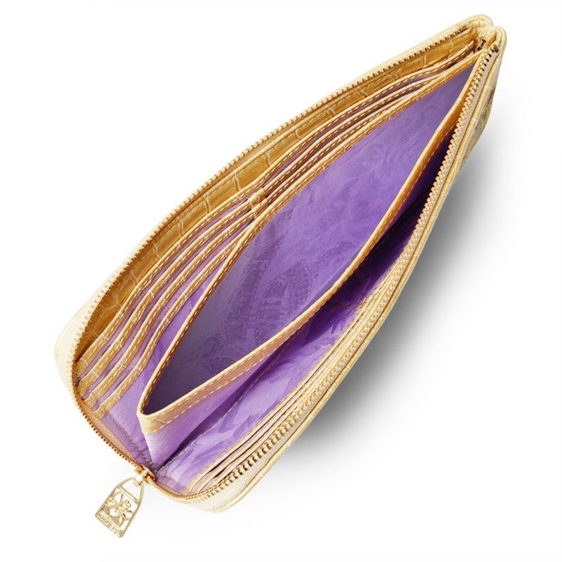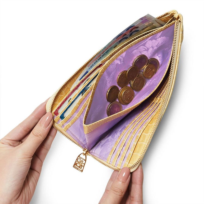 ファスナーを開くと、裏地に配した花柄ジャカード織生地のラベンダー色が、ゴールドとの配色美を生み出しています。