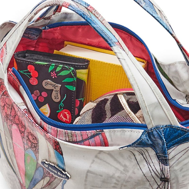 ネイビーのThink Bee!ロゴ入りプレートやブルーのファスナーがアクセントになっています。