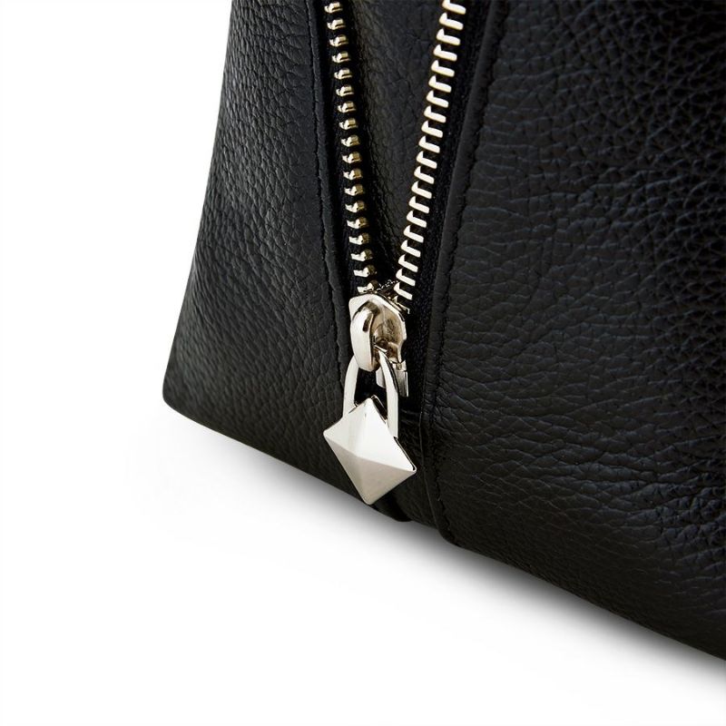 細かなシボのあるシュリンクレザーのボディに、艶のあるクロコ型押し牛革のハートをアップリケ。サイドファスナーの開閉で2通りにシルエットが変化します。ブラックレザーに合わせたシルバーファスナーがエッジの効いたラインを描き、ちょっぴりロックな雰囲気に。