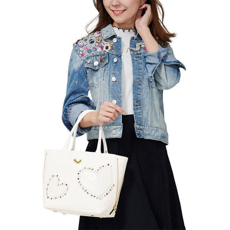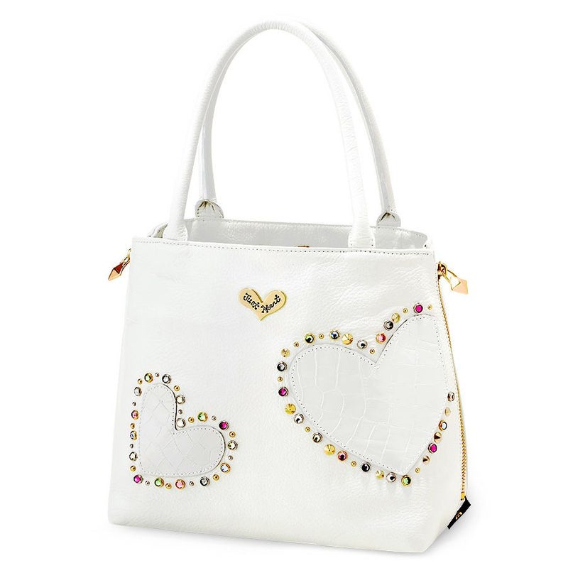 大分前からずっと気になっていたバックで、在庫が1個になり思いきって購入しました。 白が上品でお洒落で爽やか、気取らない使いやすい革と形。 優しい色合いのスワロフスキーがキラキラと綺麗で、さらにハートの中の革はクロコ型押しで凝っていて楽しい。 中の裏地がゼブラ模様で又素敵。 年齢的に可愛すぎるかしらとも思いましたが小柄な私なら大丈夫と勝手に納得。 これからの季節なら黒も欲しいなあと思ってしまいました。