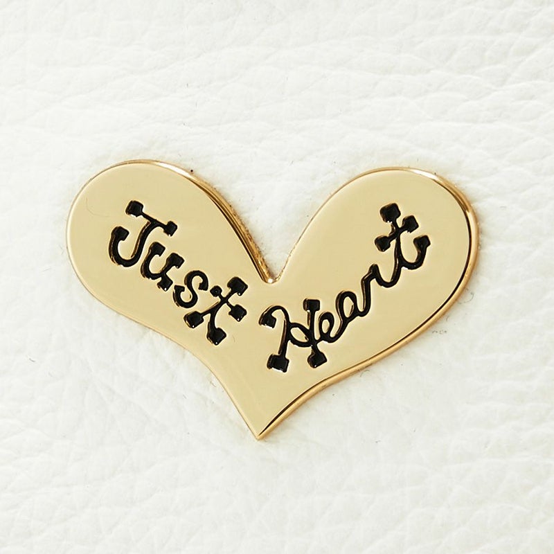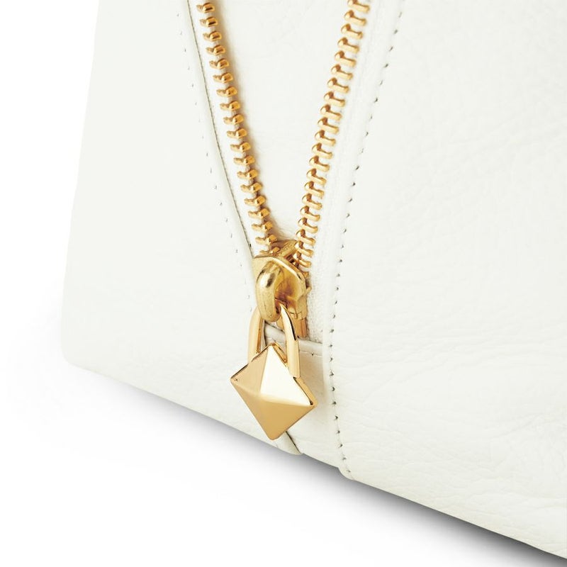細かなシボのあるシュリンクレザーのボディに、艶のあるクロコ型押し牛革のハートをアップリケ。サイドファスナーの開閉で2通りにシルエットが変化します。クリアなホワイトレザーにゴールドファスナーがエッジの効いたラインを描き、品よくモードに。
