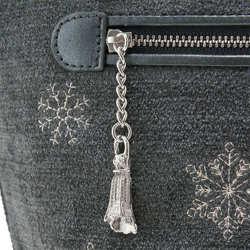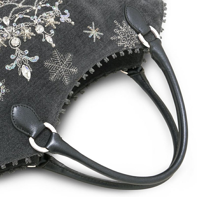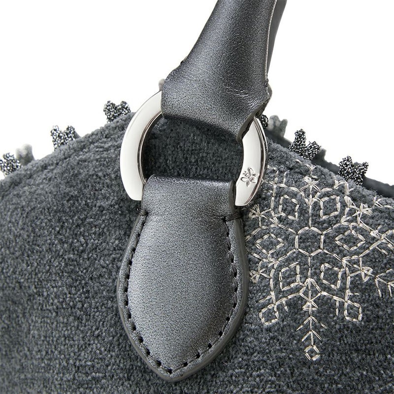 表地は、光沢感のあるグレーの織生地。大小さまざまな雪の結晶柄をボディ全体にミシン刺繍でちりばめました。