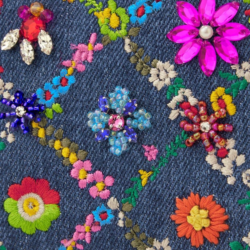 ジーンズに翔ける虹色の花模様