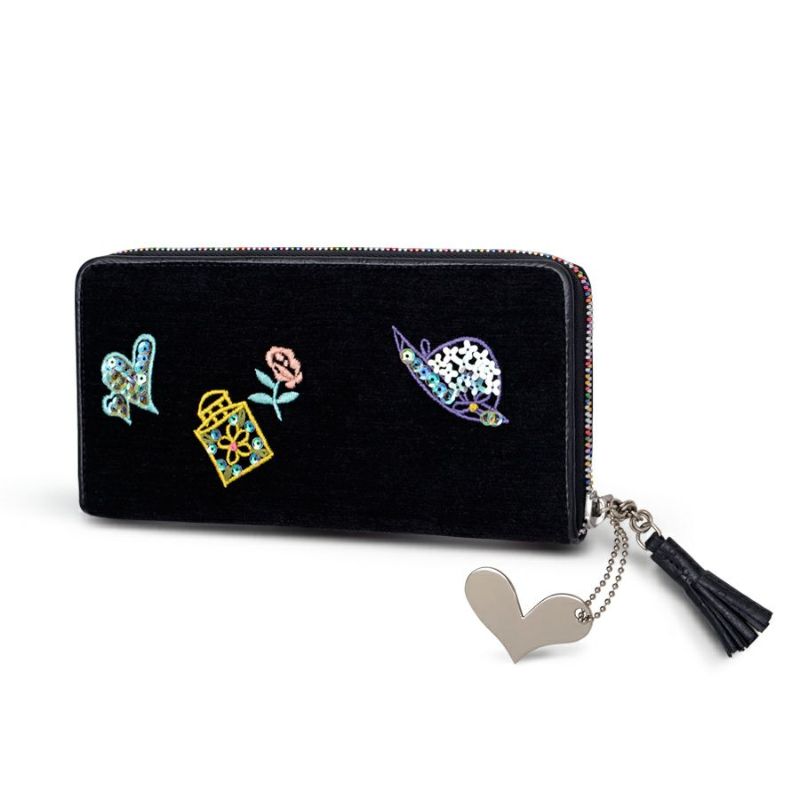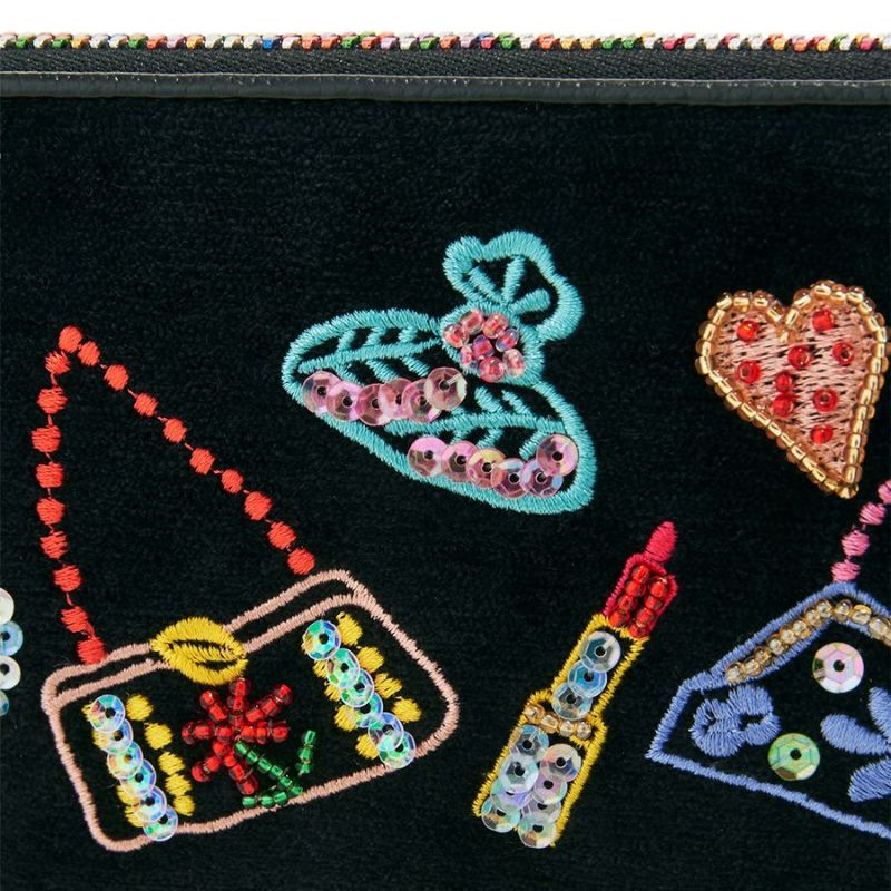 なめらかで深みのあるブラック生地に、バッグや香水瓶など女性が大好きなものを集めてカラフルにミシン刺繍で表現。さらにその上からビーズ、スパンコールをあしらって華やかさをアップしました。