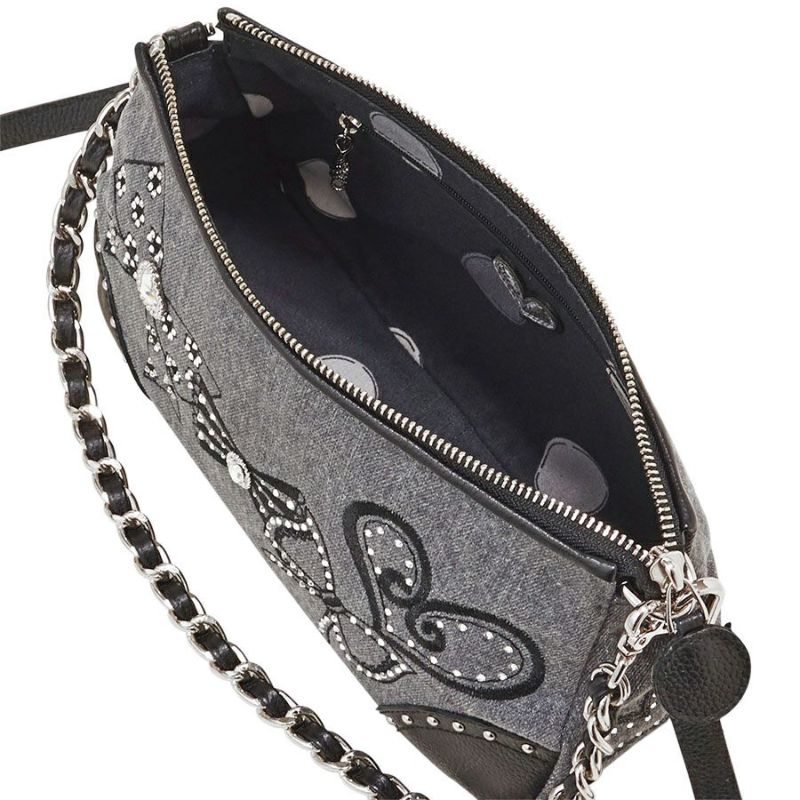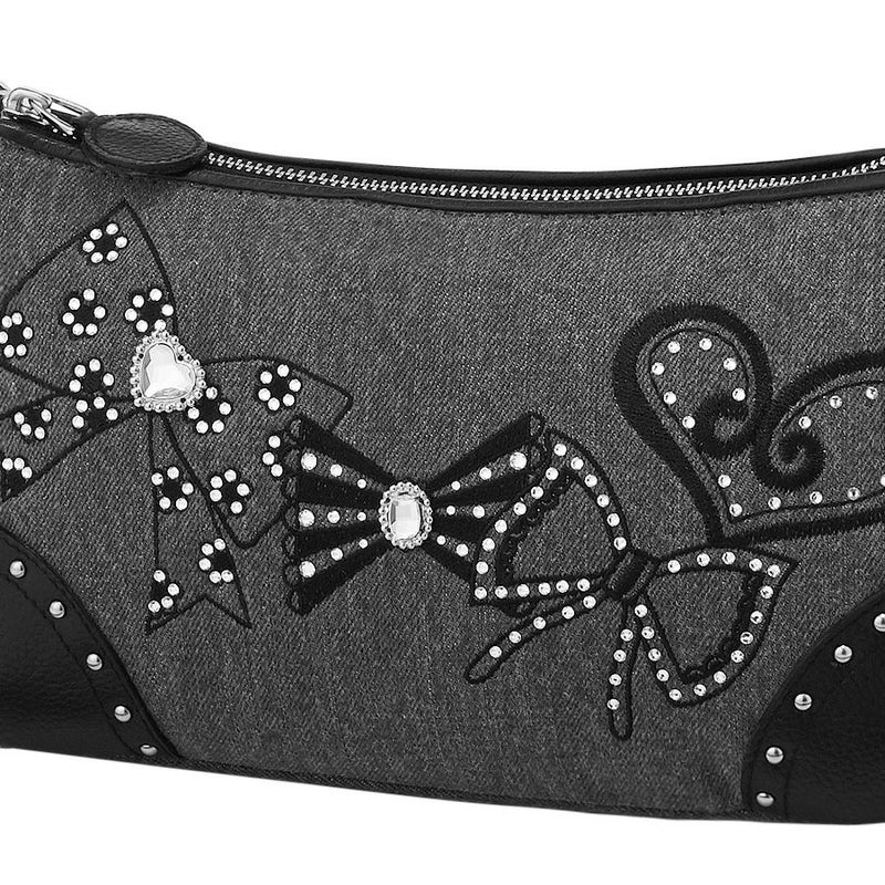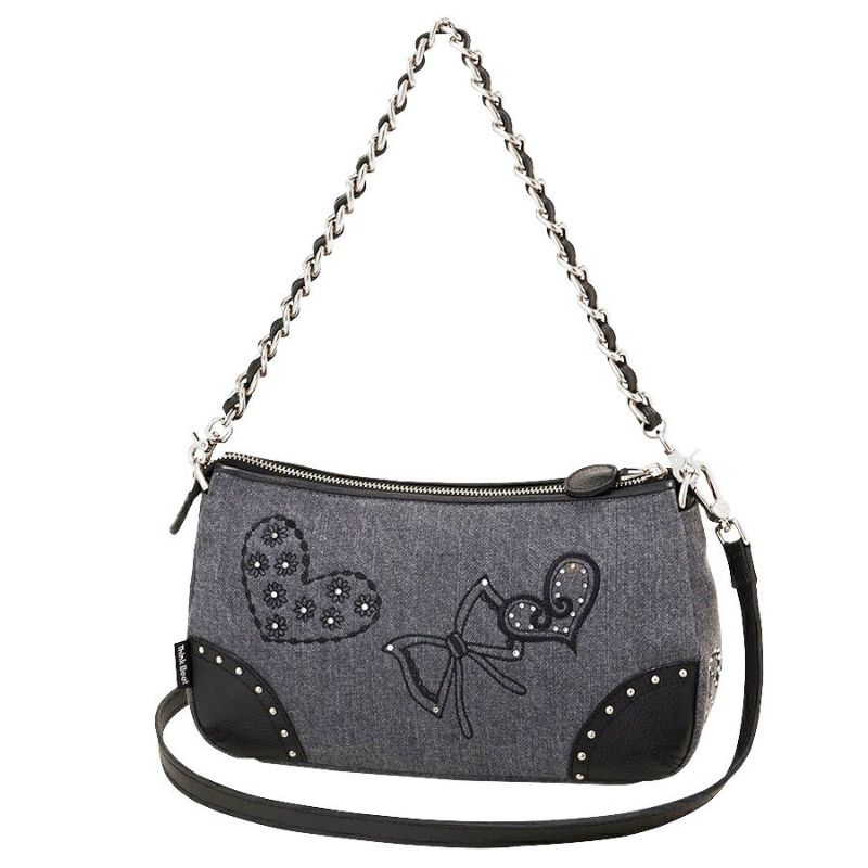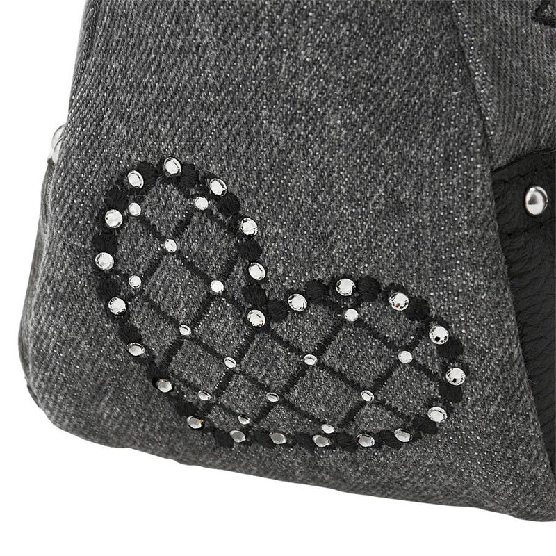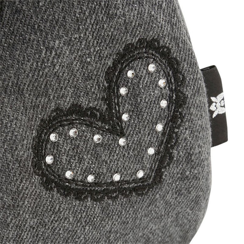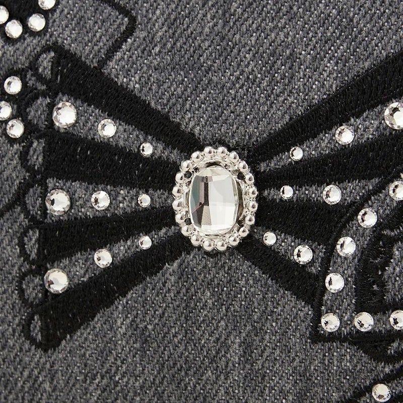 ウォッシュ加工をしたグレーのデニムに、リボンやハートモチーフをミシン刺繍で描きました。