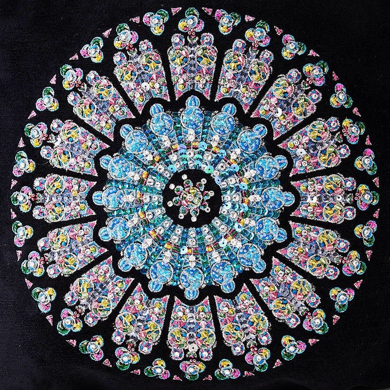 薔薇窓を様々な角度から写真撮影するところから、色彩を忠実に割り出して再現性にこだわり、世界最高峰の技術を誇る、中国・スワトウの技術と職人が丹精をこめて手刺繍を施しました。