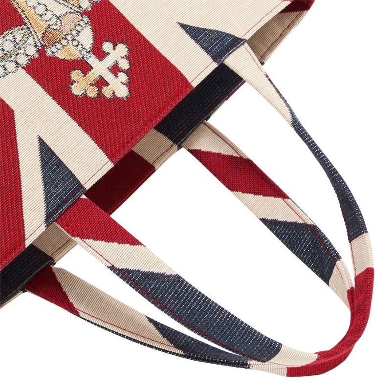ボディに使用したのは、イギリス国旗・ユニオンジャックの意匠に王冠のモチーフが大きく描かれた織生地。デニムライクなサラリとした手触りと硬めの質感がカジュアルな雰囲気のスペイン製ジャカード織生地です。インパクト抜群のこの柄をシンプルなトートバッグにアレンジすることで、フラッグ柄をより大胆に魅せています。