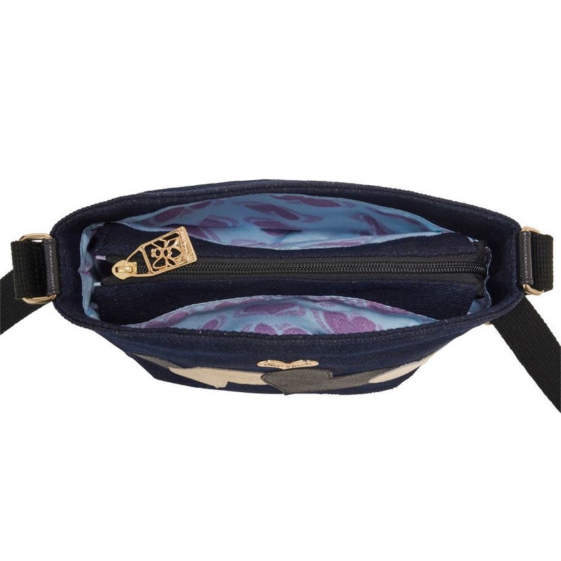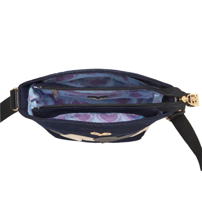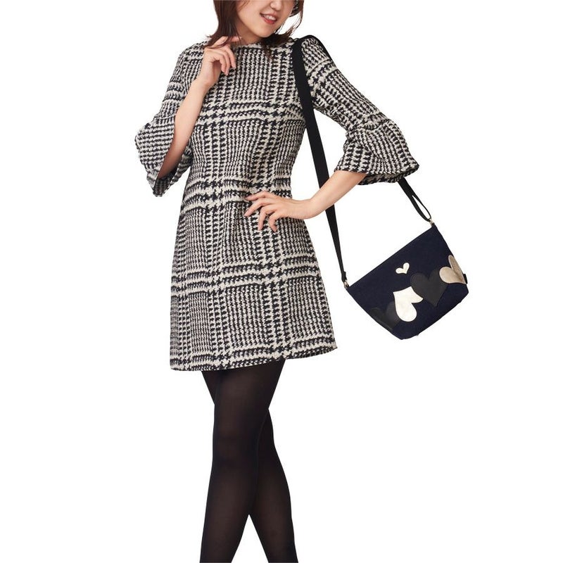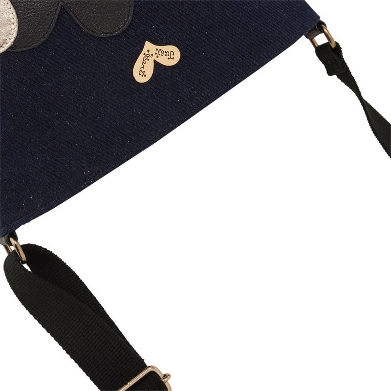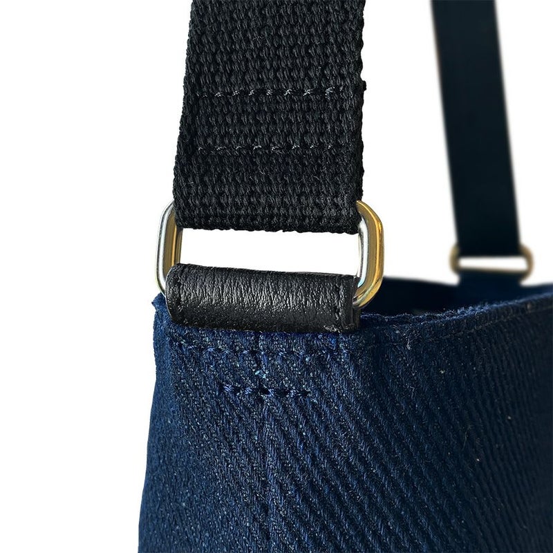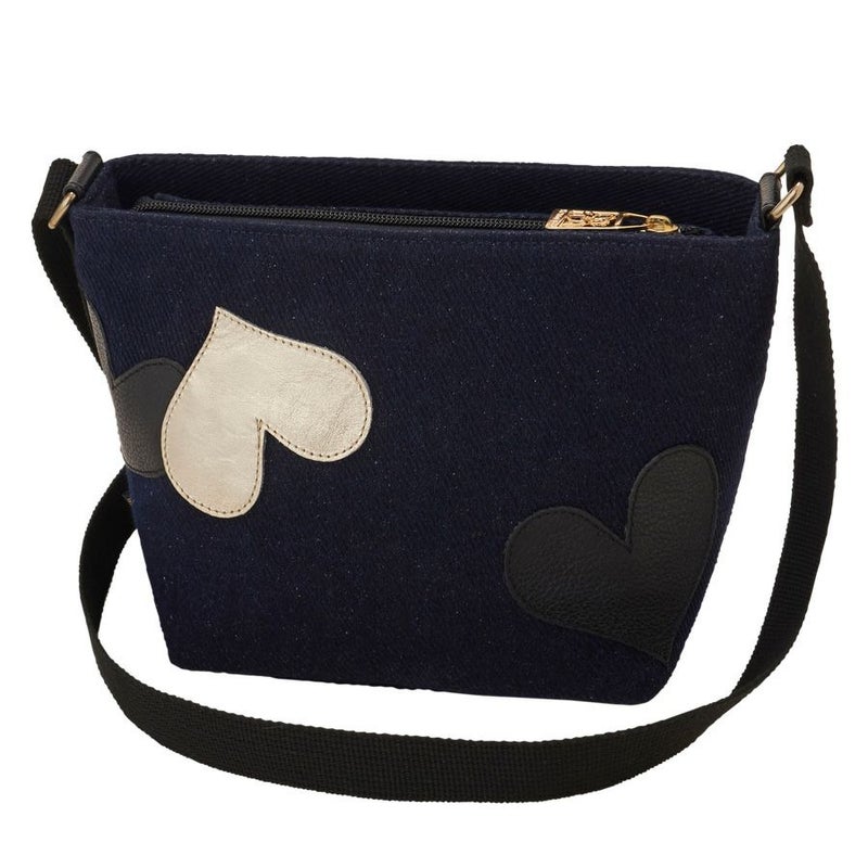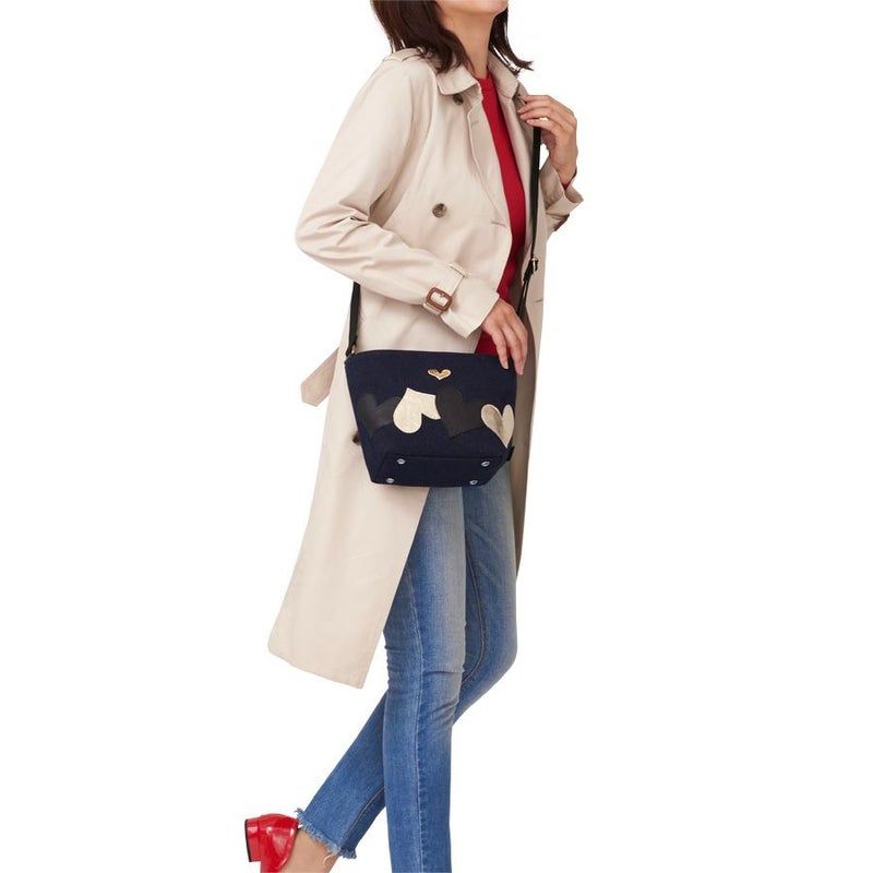 ボディに使用したのは、ネップが入った少し温かみのある風合いの深いネイビー。このカジュアル感のある生地に、ブラックとゴールドの牛革レザーハートを弾むようにパッチワーク。