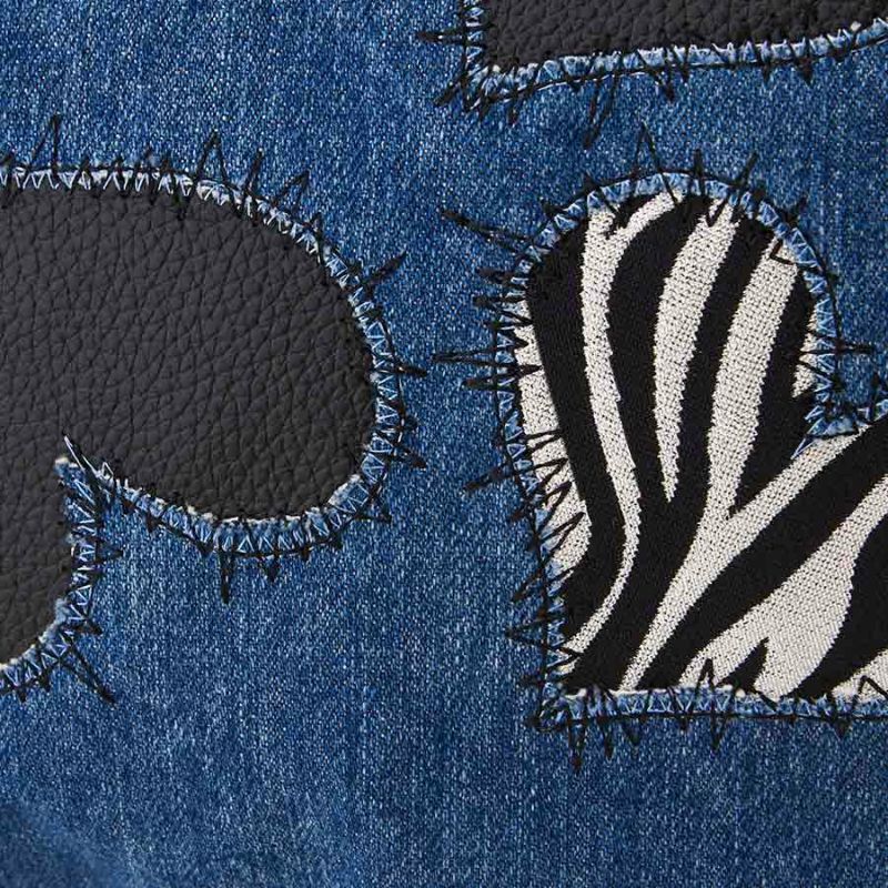 ハンドル部分は、なめらかでソフトな手触りの牛革シュリンク。ブラック牛革のもつインパクトや、ゼブラ柄に織り込まれたシルバーラメの煌めきによって、全体がきりっとシャープな印象に。