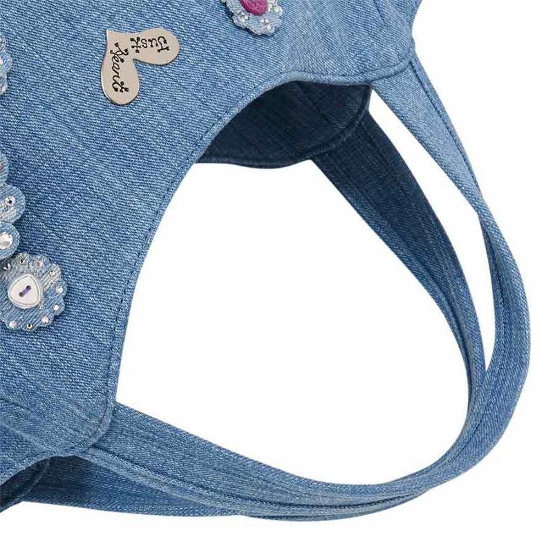 裏地はブルー地にパープルのハートプリント生地で爽やかに、デニムと相性も抜群!