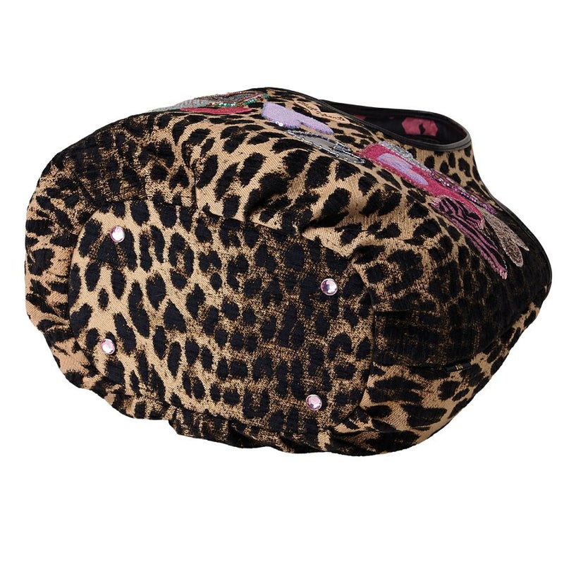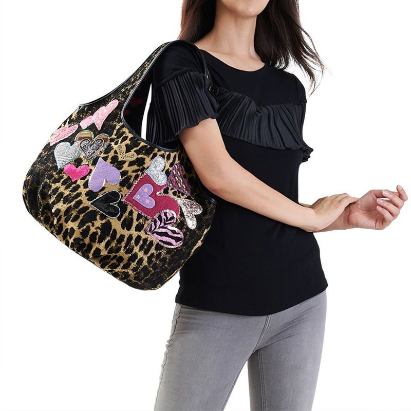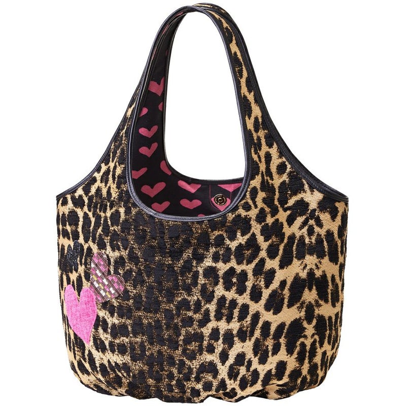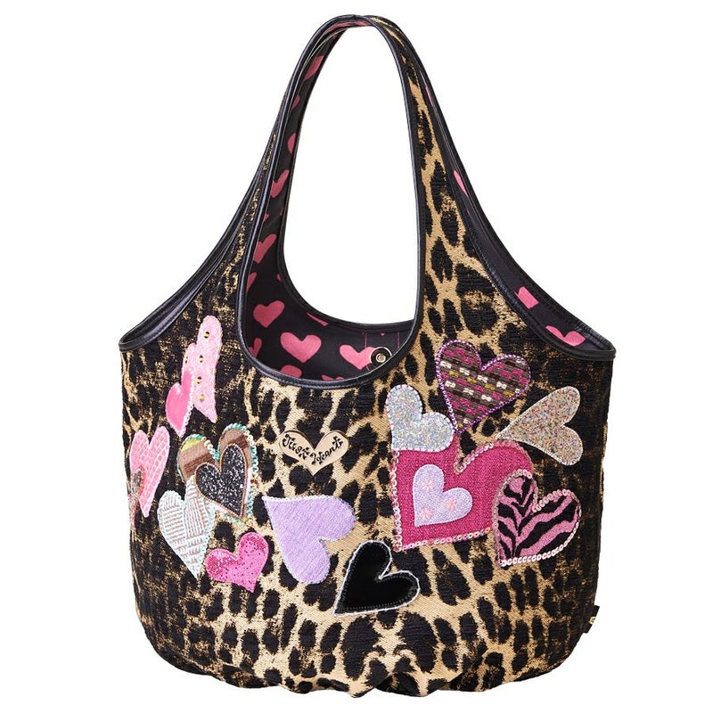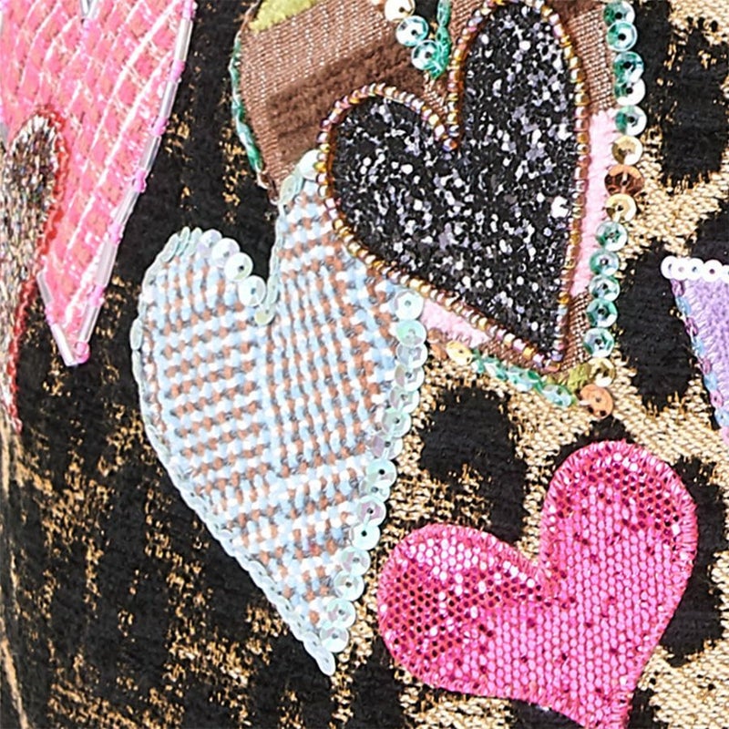 イタリア製、レオパード柄のジャカード織生地にカラフルなハートのアップリケをポップな感覚であしらいました。