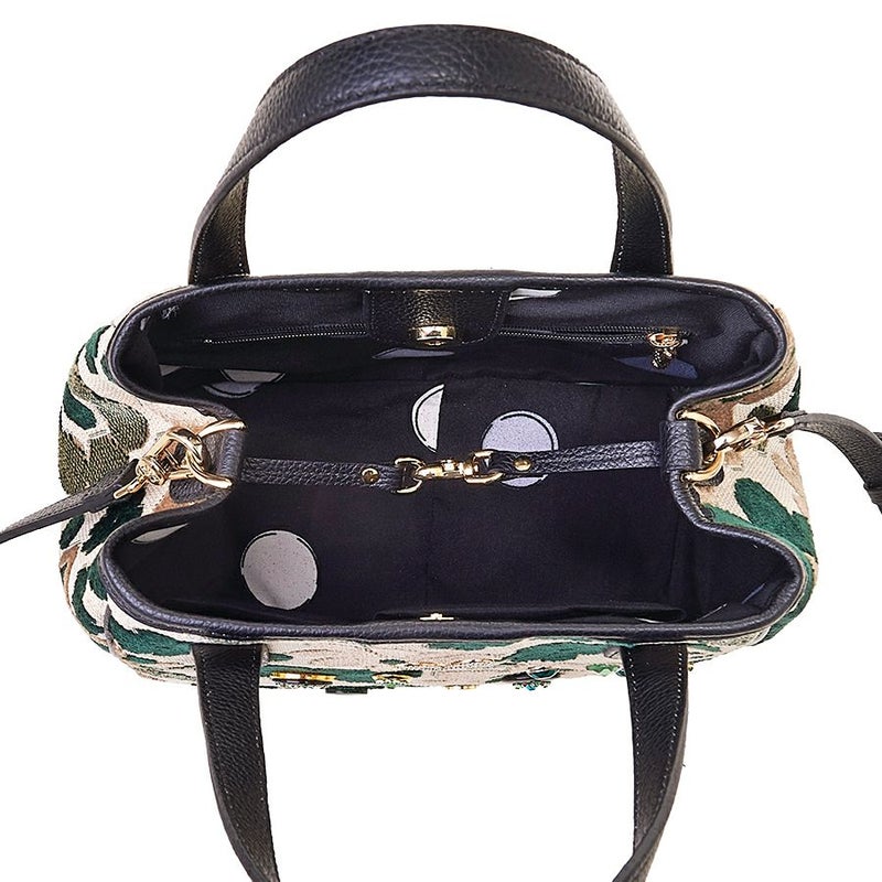 レザーの縁取りを施した開口部は、大きく開いて中が見渡しやすいマグネットホック式。マグネットホックは、レザーパーツに付けて、広い開口部でも留めやすいようデザインしました。