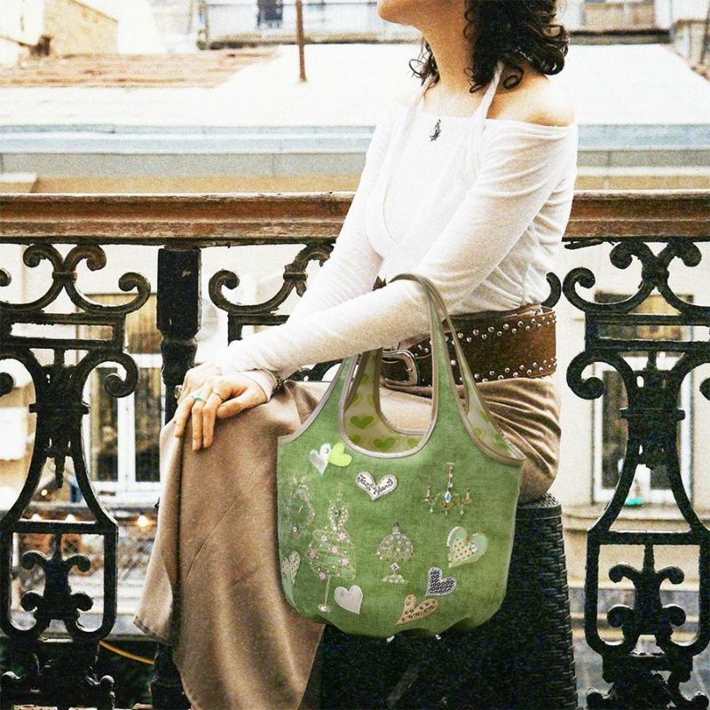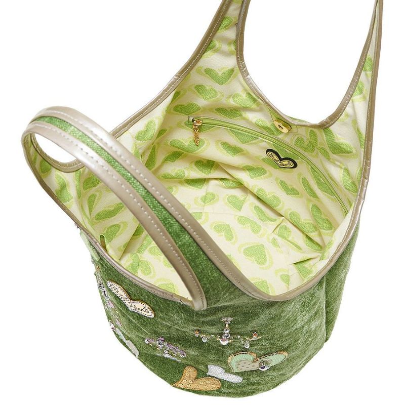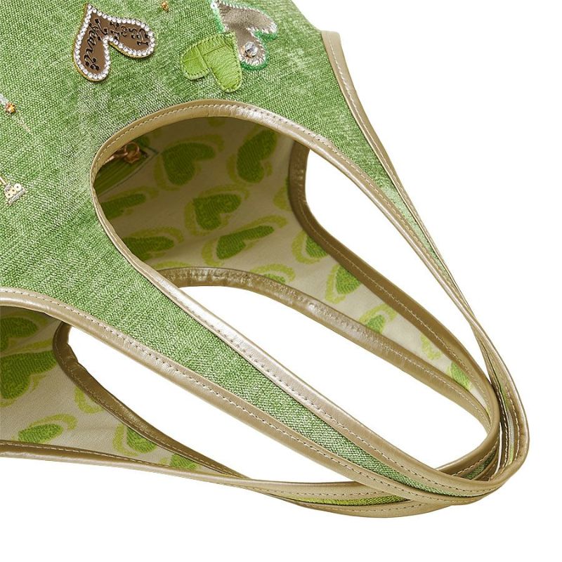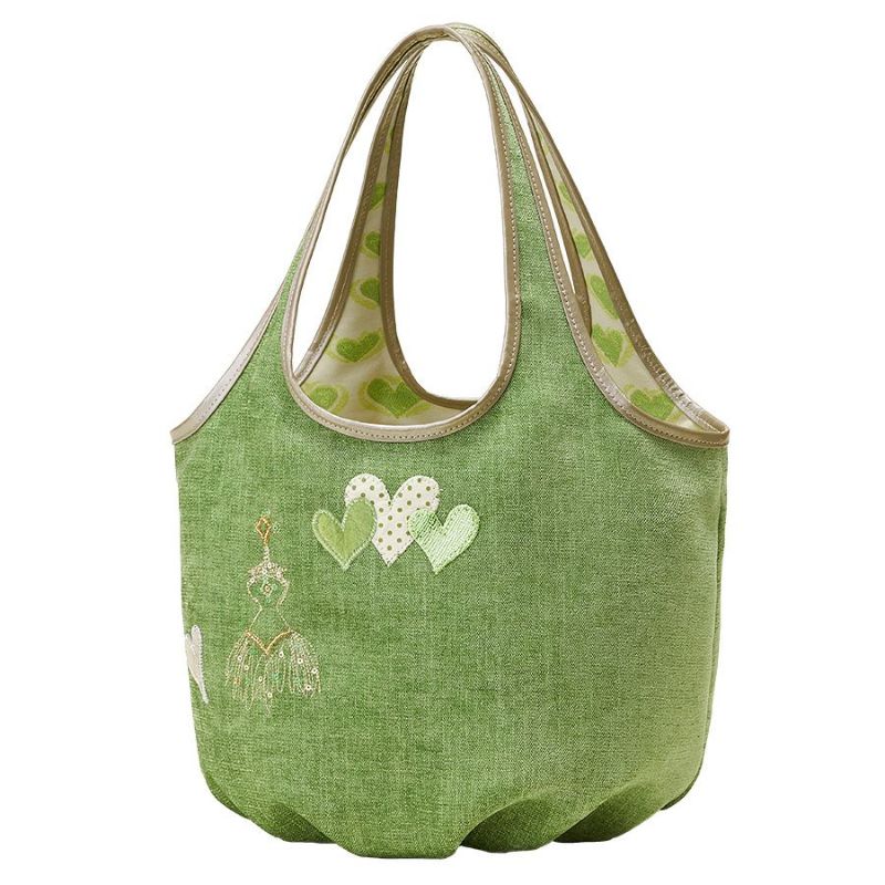 手触りの良い光沢のあるグリーンのトルコ製生地に、プリンセスの弾む心の内をそのまま刺繍で表現したようなモチーフと、レザーハートをビーズやスパンコール、クリスタルガラスなどバランスよく散りばめて輝きを添え、装飾やマグネットなどのパーツには、グリーンのベースに合うオールドを効かせました。動きにあわせて反射する光の輝きが、上品なアクセントになっています。