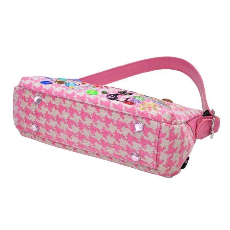 背面にはすぐに取り出したい時に便利なファスナーポケット付き。ファスナー周りのパイピンクにピンクの型押し牛革を使用し、千鳥柄を上品に見せる引き締め効果と高級感のある印象に。