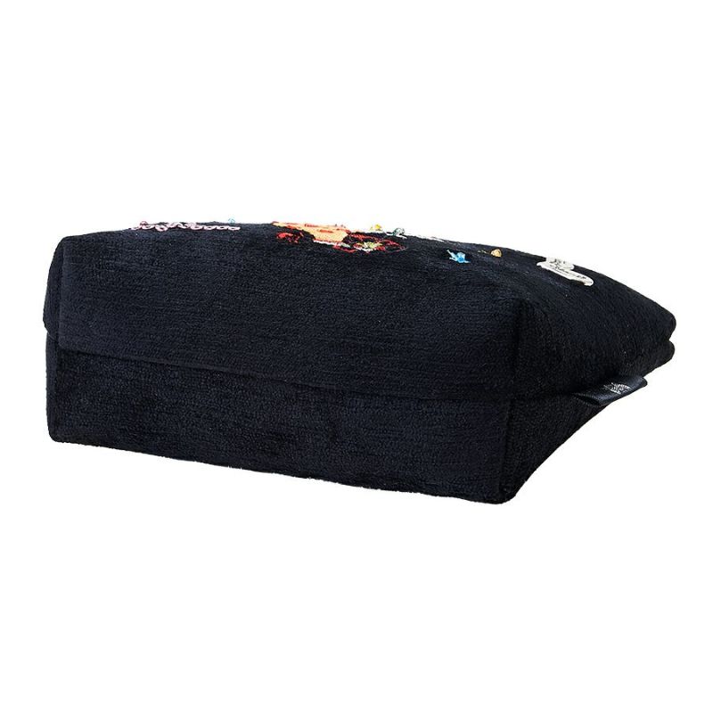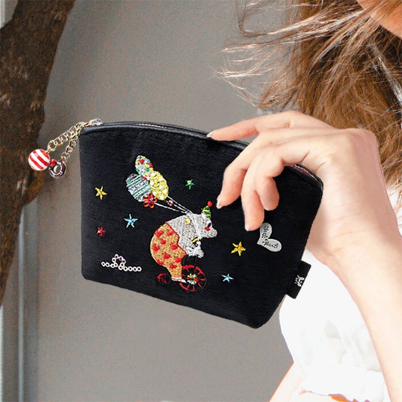 マットな漆黒のトルコ製生地に、風船を持ちながら自転車をこぐ様子をミシン刺繍で表現しました。