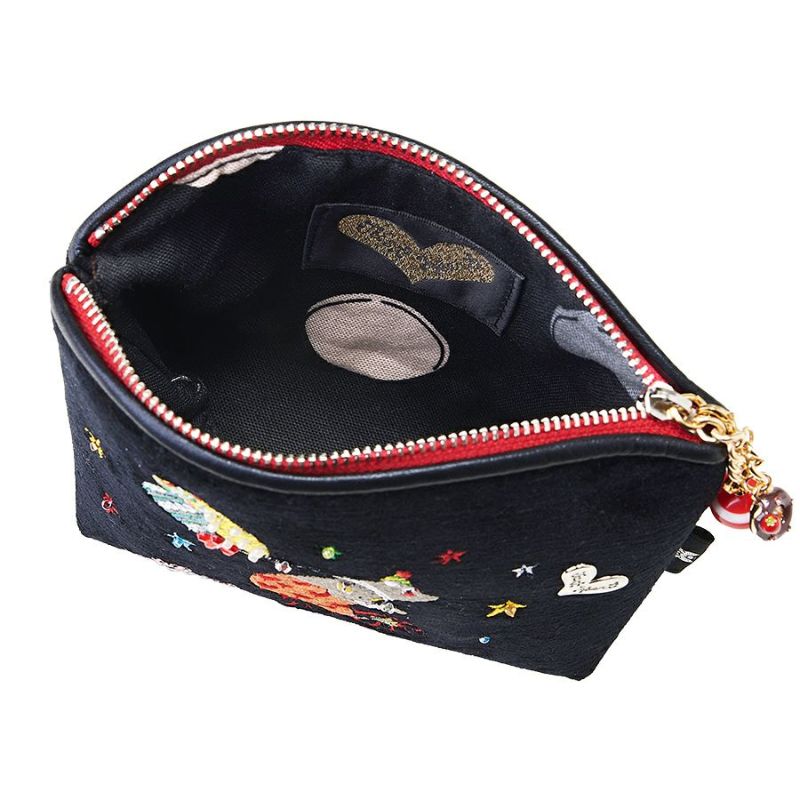 開閉はファスナー式で、普段よく使う小物アイテムをマルチに収納でき、使い方は自由自在。マチ幅があるので見た目以上の収納力があり、内側には外側とほぼ同幅のオープンポケットが2つ。細々としたものも整理しやすく便利です。
