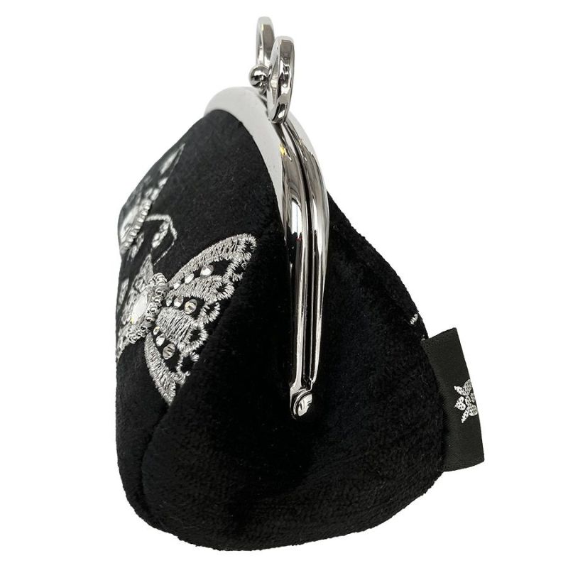 なめらかな手触りと深みのある黒が印象的なトルコ製の織生地に、楽しげに踊るようなリボンやハートの甘いモチーフをシルバーの刺繍でシックに表現。