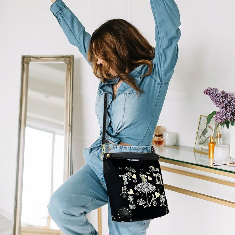 手触りの良いトルコ製の漆黒生地にプリンセスの弾む心の内をそのまま刺繍で表現したようなモチーフをビーズやスパンコール、クリスタルガラスなど、バランスよく散りばめて輝きを添えました。