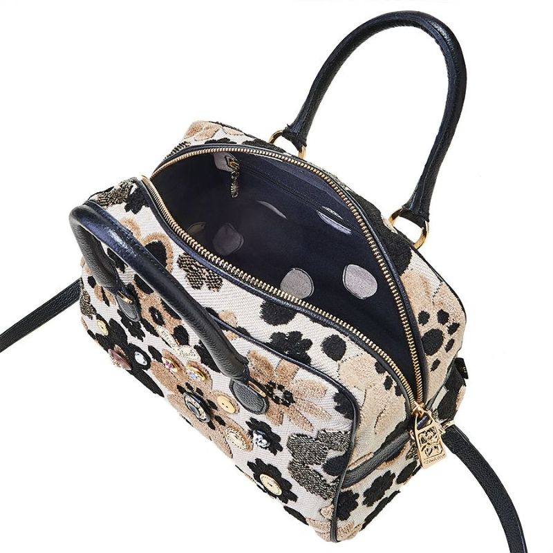 マーガレットの色合いとボストンバックの形に目が釘付けの一目惚れで予約注文してようやく手元に届きました。 本当に素敵です。 ベージュの色彩のマーガレットはスワロフスキーのボタンがキラキラと、シックな大人のエレガンスと華やかさ感じさせます。 もちろんポケット充実やベルトもあり機能性も素晴らしい。