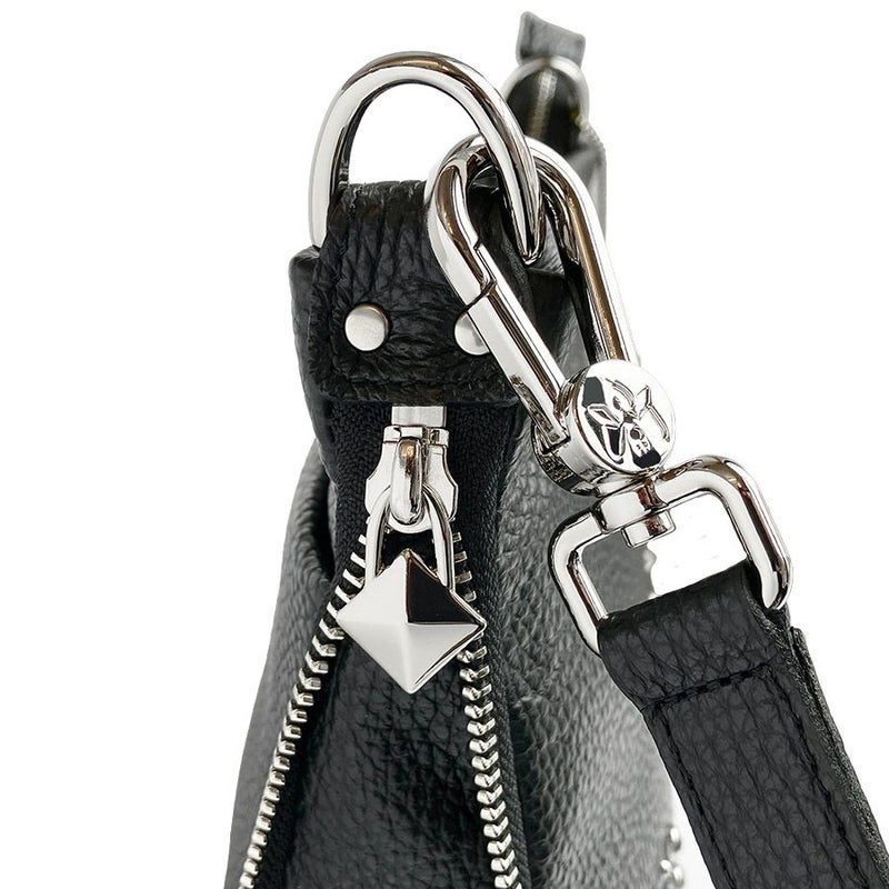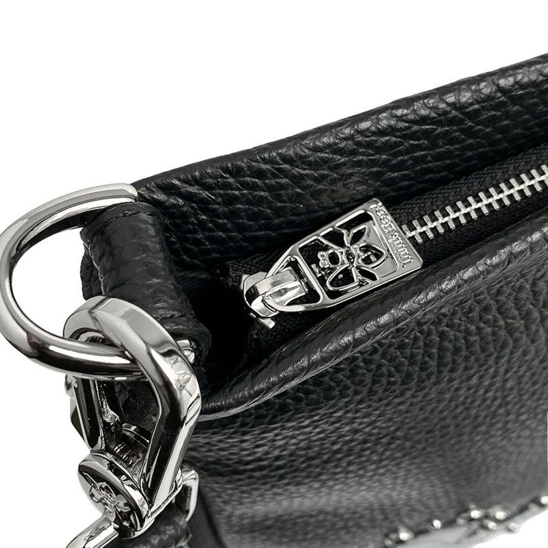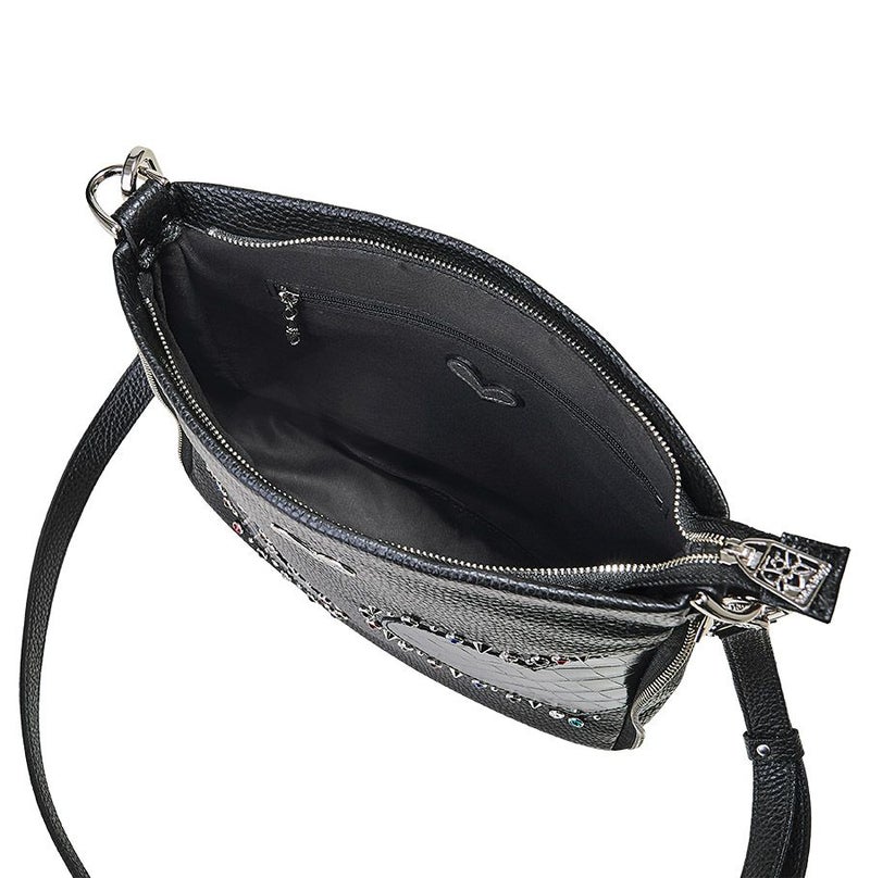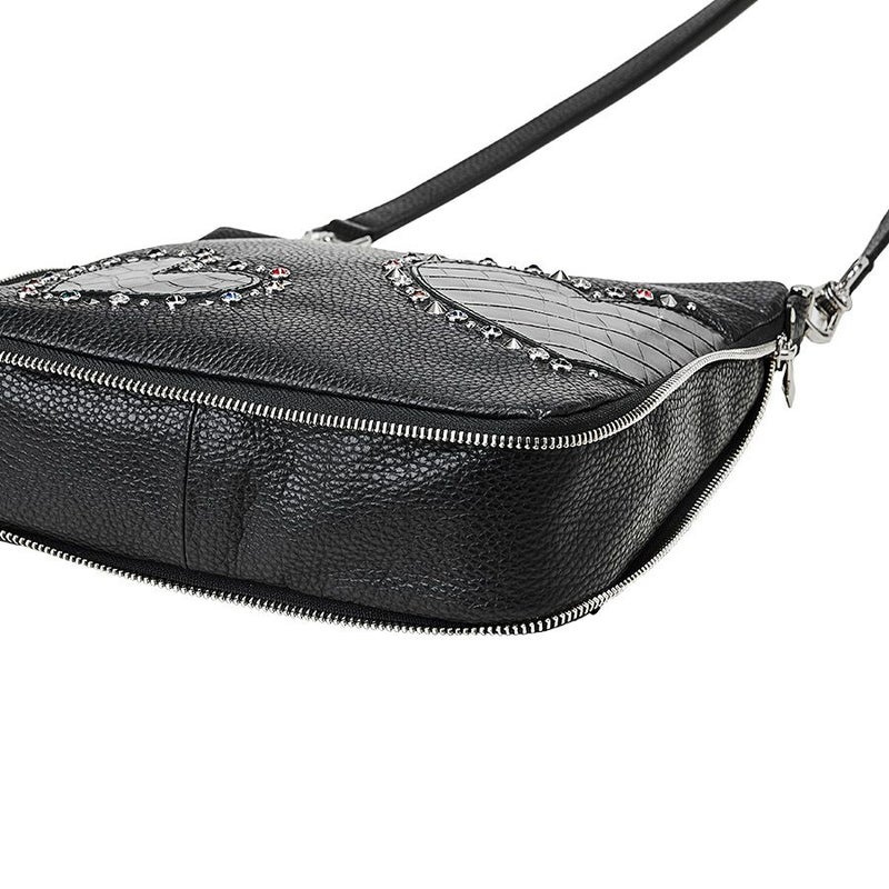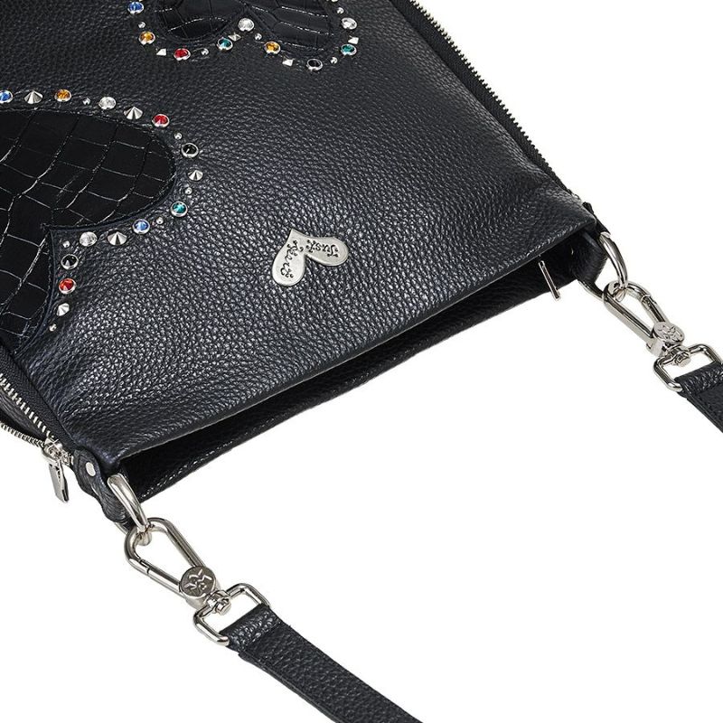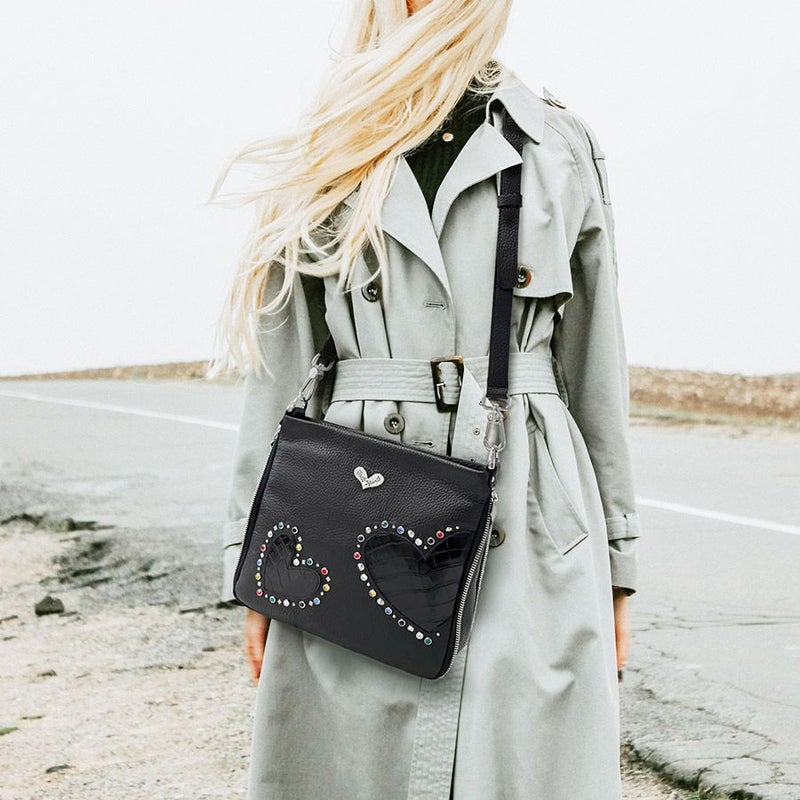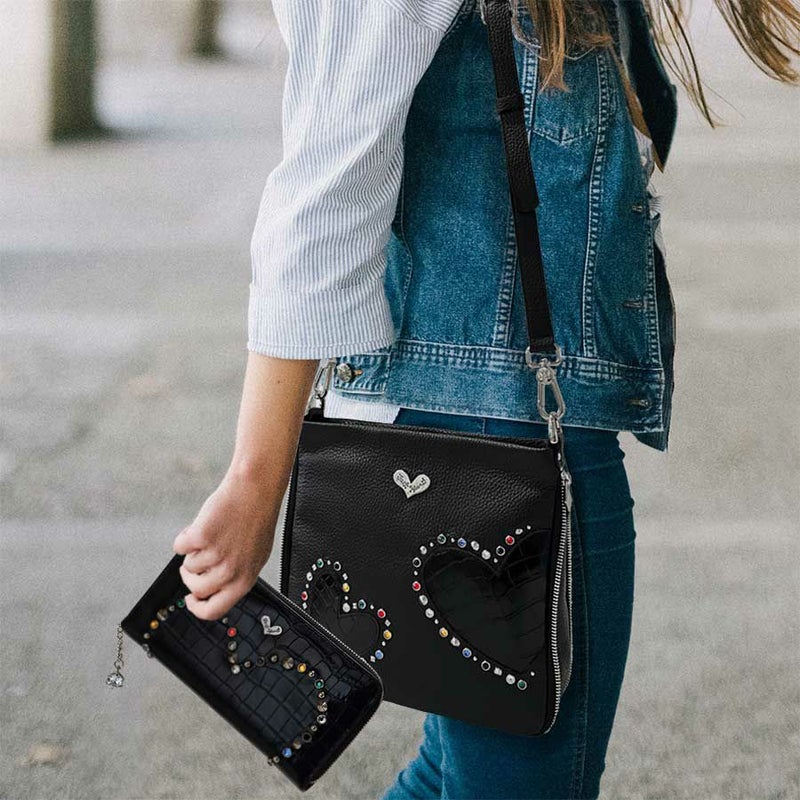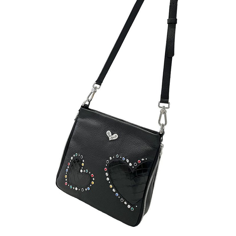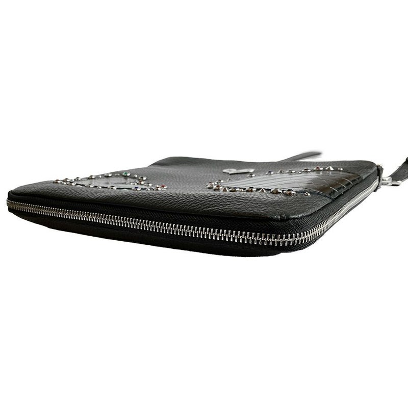 シボのあるブラックの牛革をベースに、艶のあるクロコ型押し牛革のハートをアップリケ。