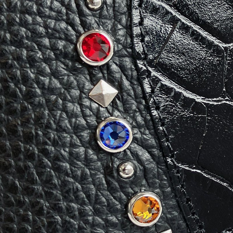 6色のスワロフスキー・クリスタルを始め、様々な形のスタッズでカラフルなアクセントを効かせたデザイン。