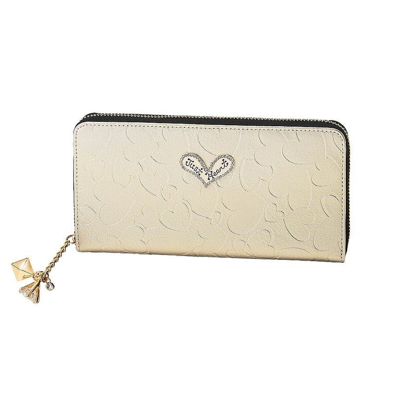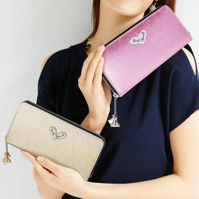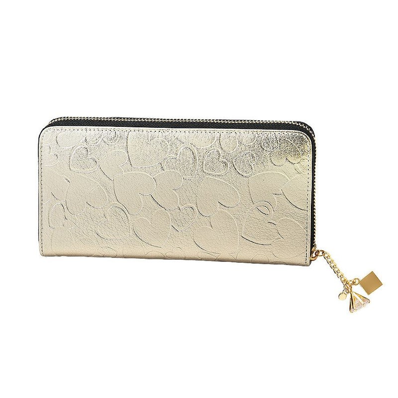 上品なシャンパンゴールドの型押しメタリックレザーは存在感抜群!しっとりと手に馴染む、シンメトリーのハートを型押ししたこのレザー(牛革)は日本製で、洗練された繊細な美しい光沢が魅力です。