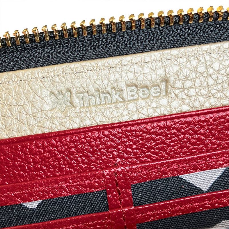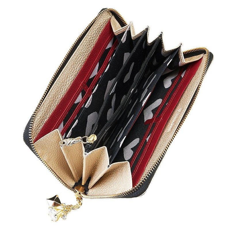 ぐるりと大きく開くラウンドファスナーを開けると、中も見やすく、中央のファスナー式小銭入れを挟んで、札入れやカード入れをシンメトリーに配置。