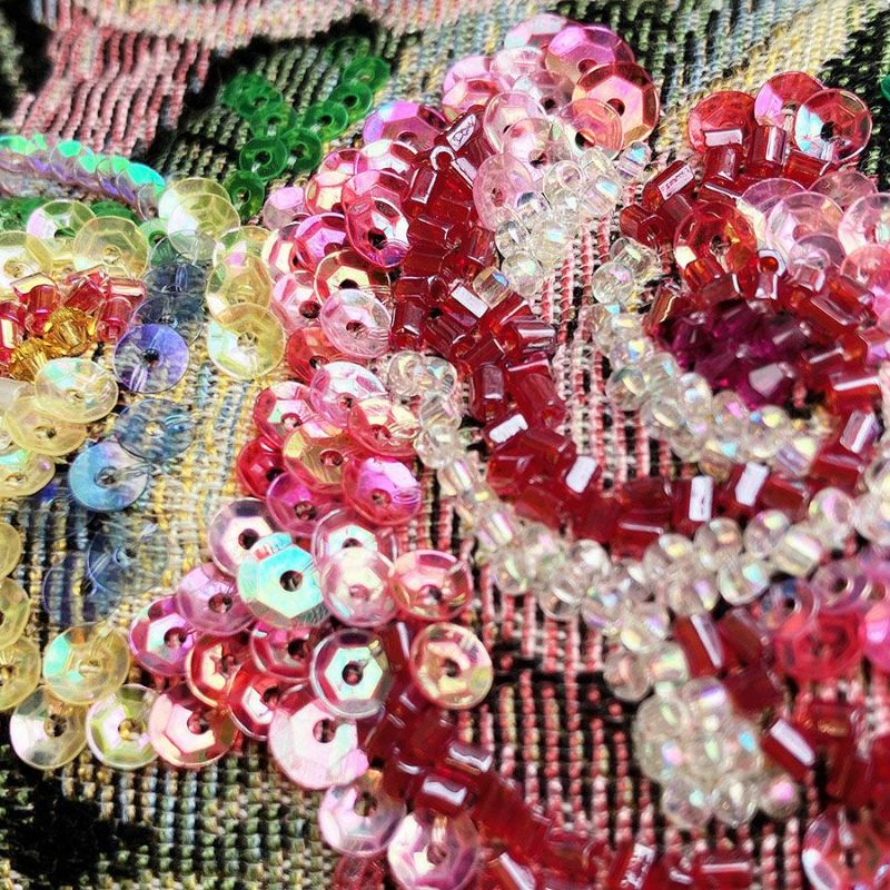 イタリア製のゴブラン織生地にビーズ・スパンコールを贅沢に手刺繍することで、立体的でボリュームたっぷりのデコレーションが美しい。花々の煌めきがエレガントな口金ポーチです。