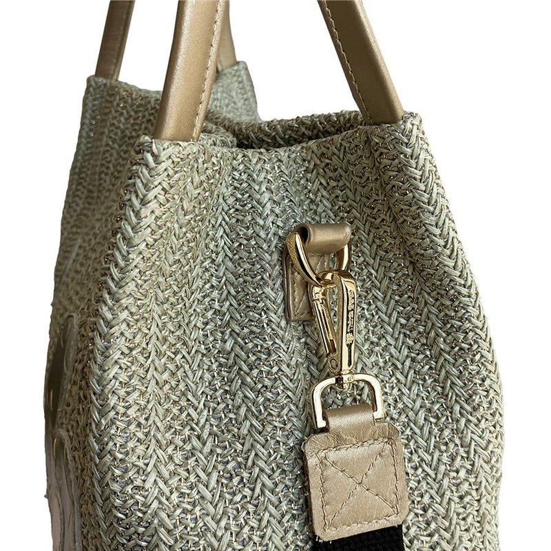 ベースに使用したのはゴールドのラメ糸を織り込んだ、さらっとした日本製のラフィア風生地。