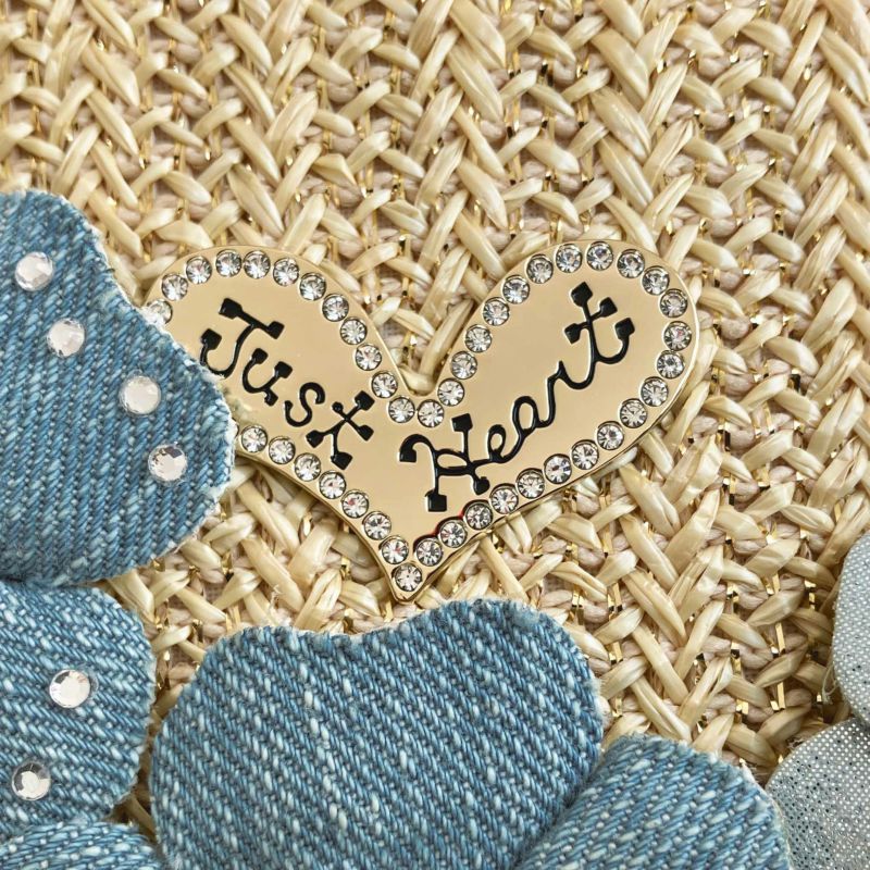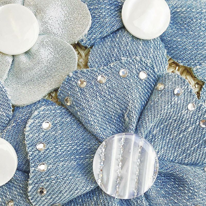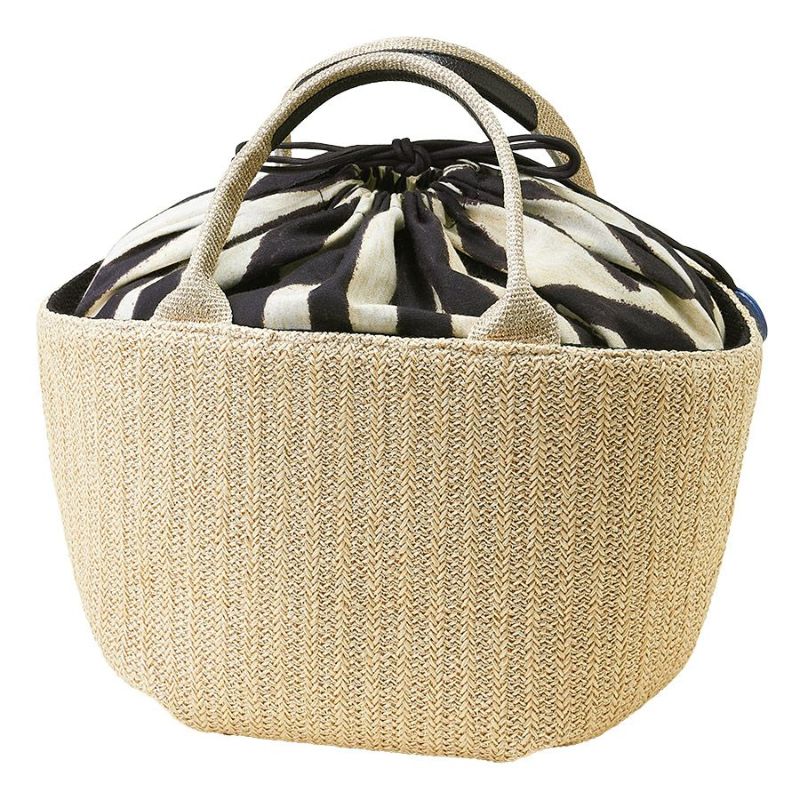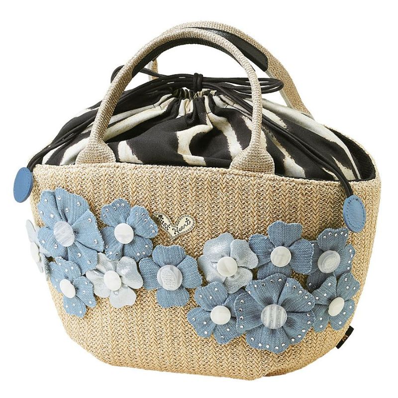 ゴールドのラメ糸を織り込んだ、さらっとした日本製のラフィア風生地に、素材の異なる爽やかなライトブルーのフラワーモチーフがキュートに咲いたカゴ風バッグ。