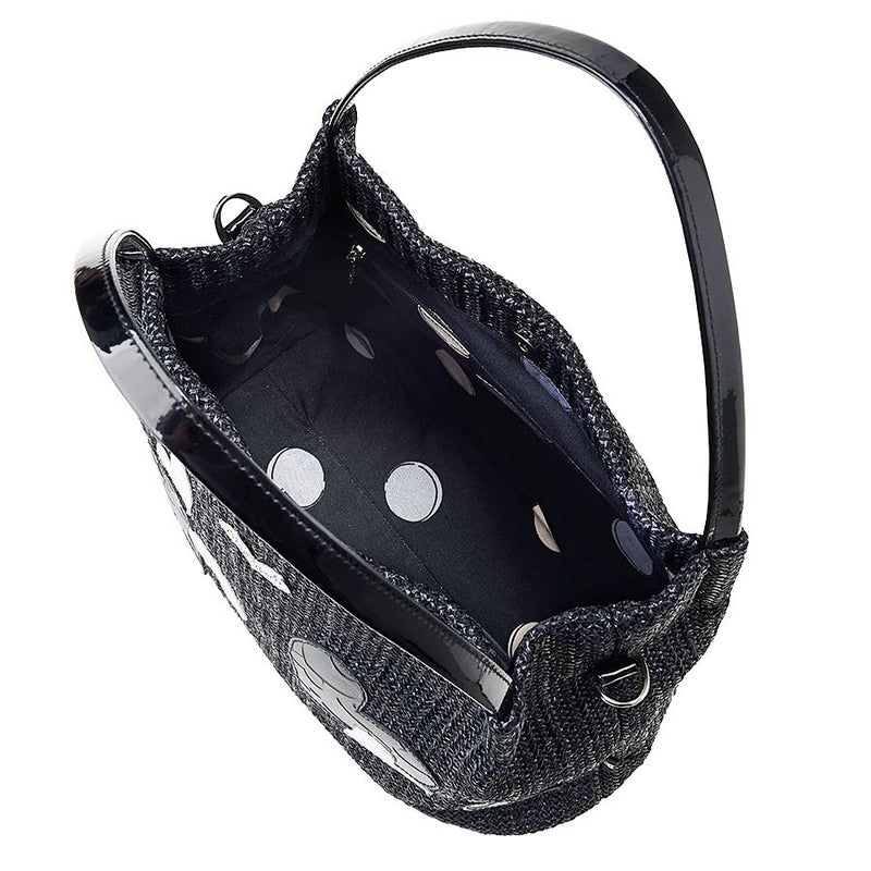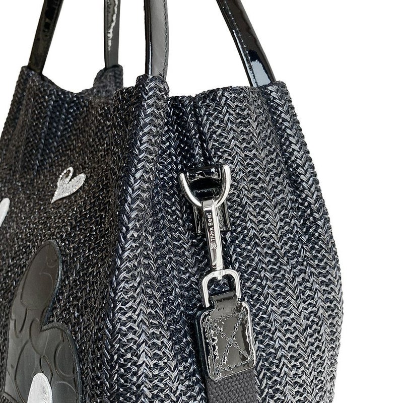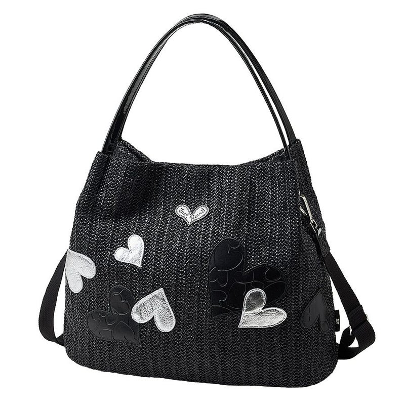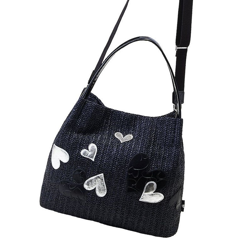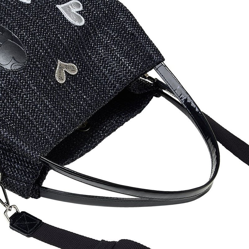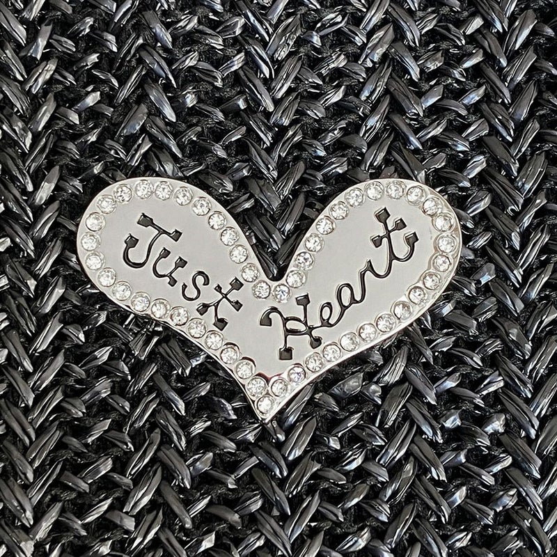 クリスタルガラスで縁取られた煌めくJust Heartのロゴ入りメタルプレートをあしらい、華やかさをプラス。ブラック×シルバーのリズミカルに踊るハートのコンビネーションがクールで表情豊かなバッグに仕上げています。