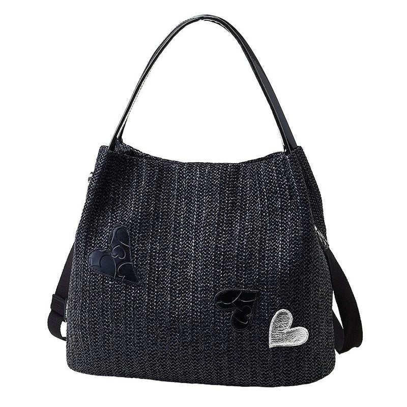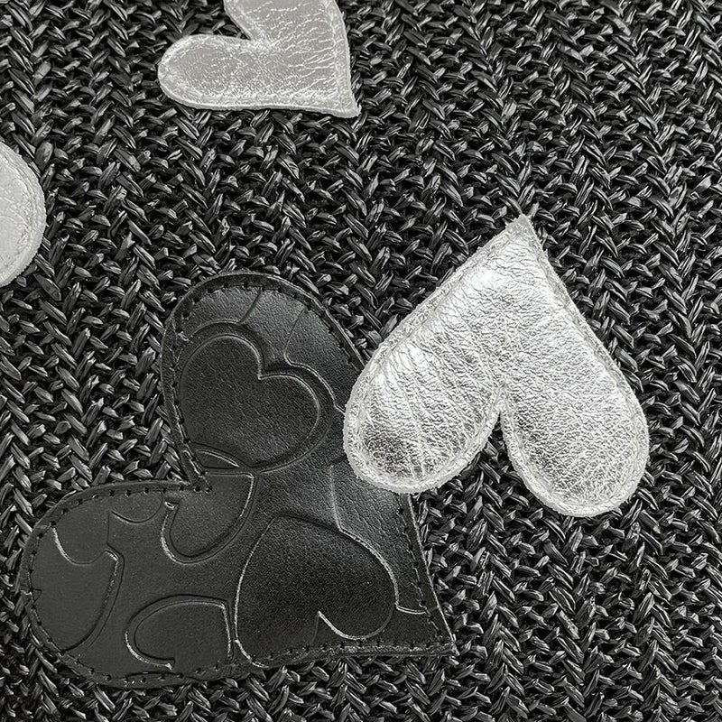 ベースに使用したのはさらっとしたブラックの日本製のラフィア風生地。チクチクせず引っ掛かりがないのも嬉しいポイントです。その生地にブラックのハートの型押と、シルバーのメタリックハートをアップリケ。