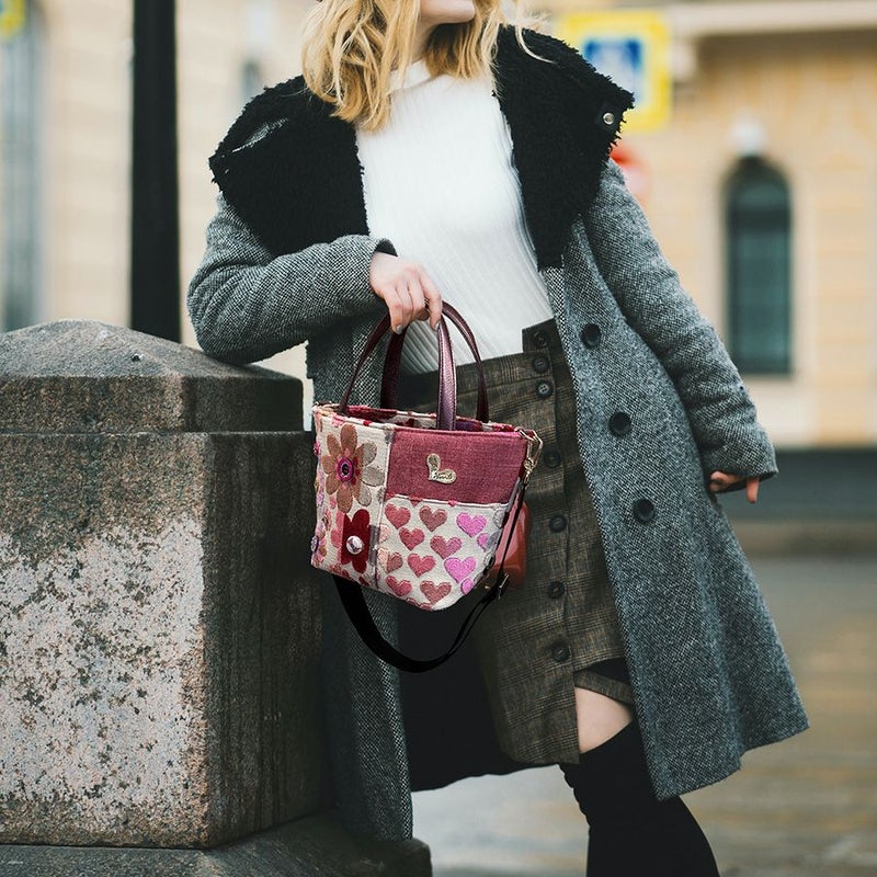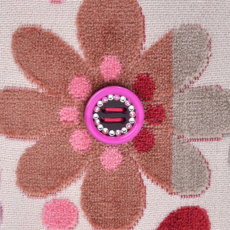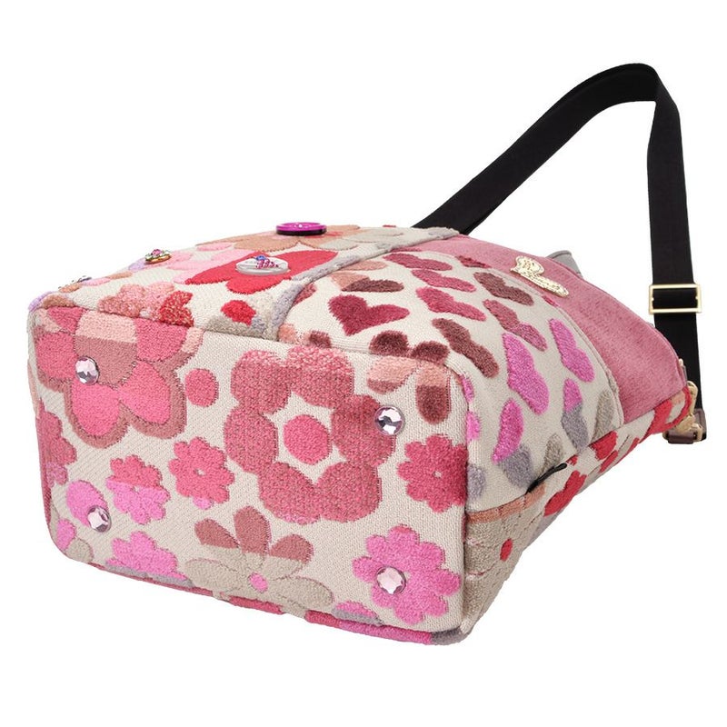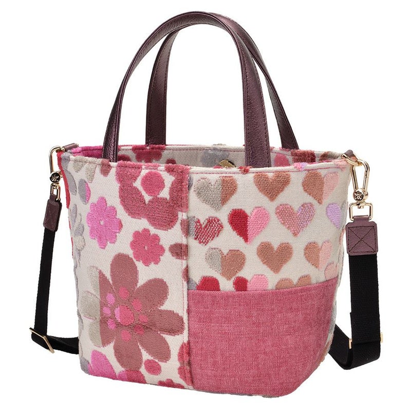 ボディに使用したのはベルギー製の織生地。ピンク系にパープルとライトグレーが混じり合う表情豊かなマーガレットとハート柄生地は、パイルを凹凸に織り込んで柄を表現したふわふわと柔らかい質感が特徴です。この可愛いコンビネーションに、印象の引き締め効果として無地を合わせました。