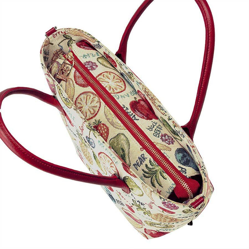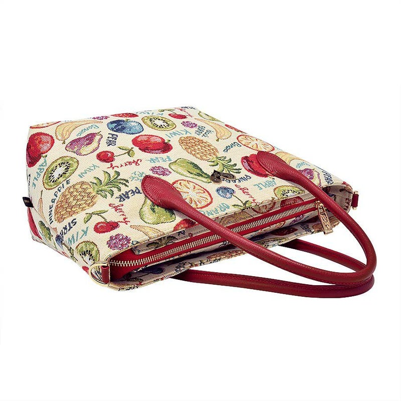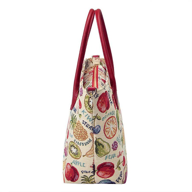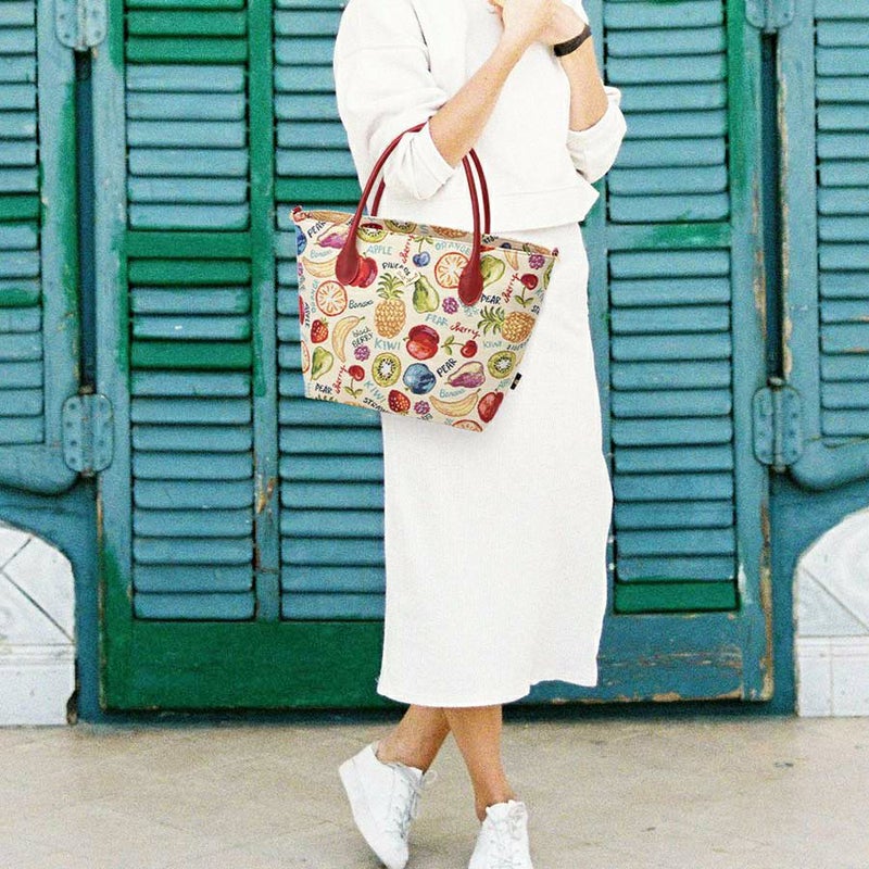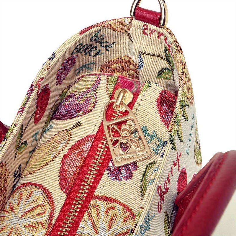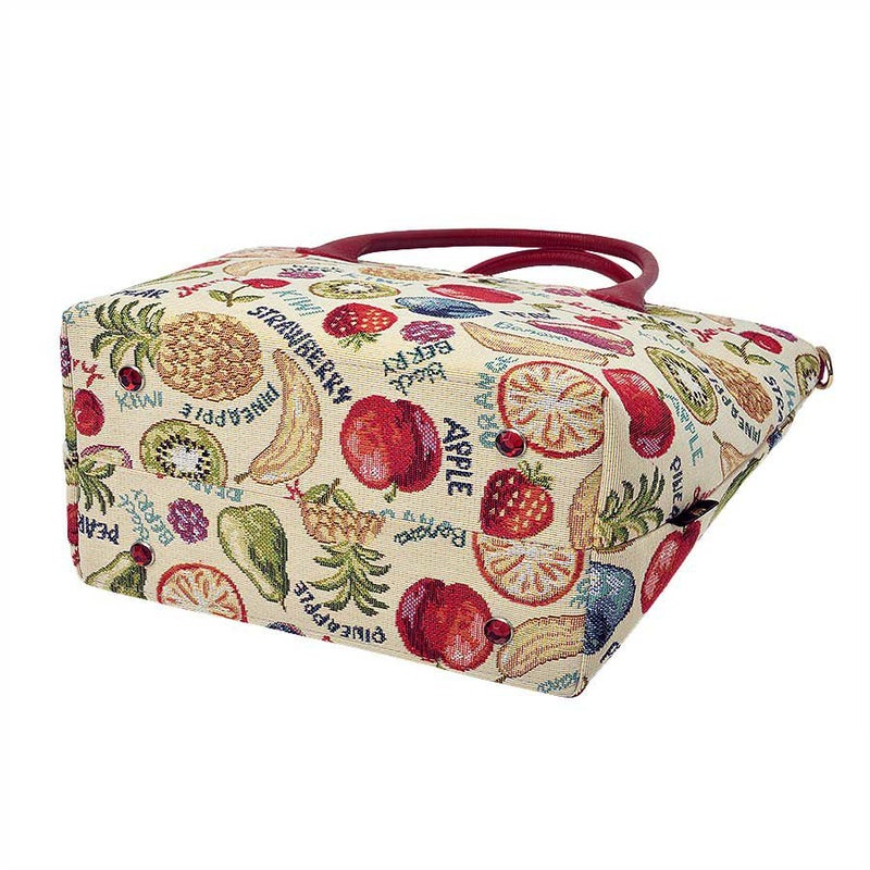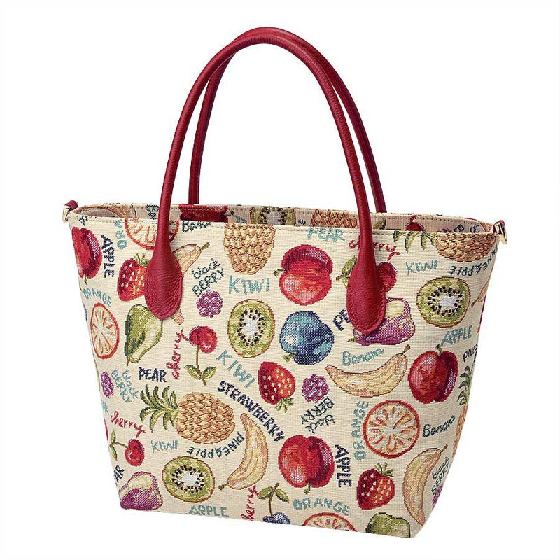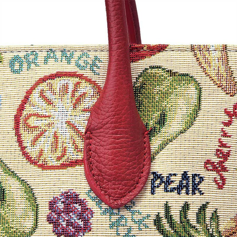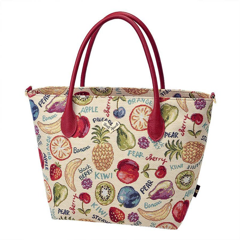 立体感や陰影の濃淡を表現したフルーツたちと、APPLEやblack BERRYなどの文字との組み合わせがキュートなゴブラン織生地はスペイン製。