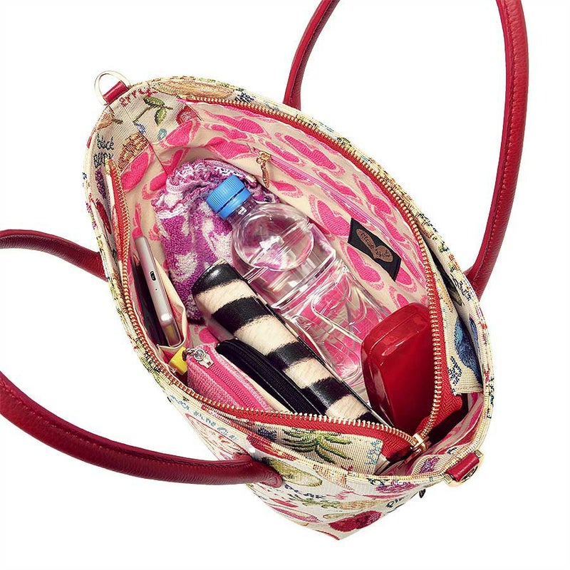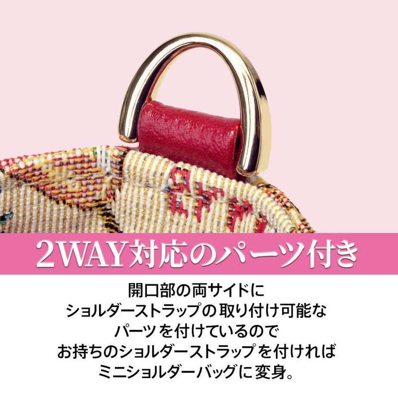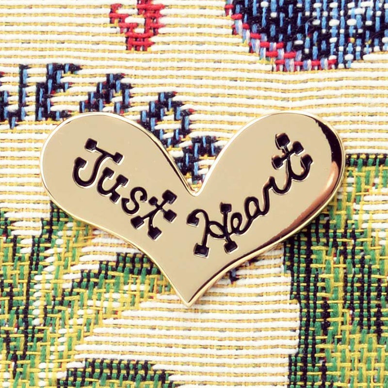 このポップでキュートな織生地をいかして、あえて装飾は施さず、前面にゴールドのJust Heartのロゴ入りプレートをあしらって、ワンポイントアクセントに。