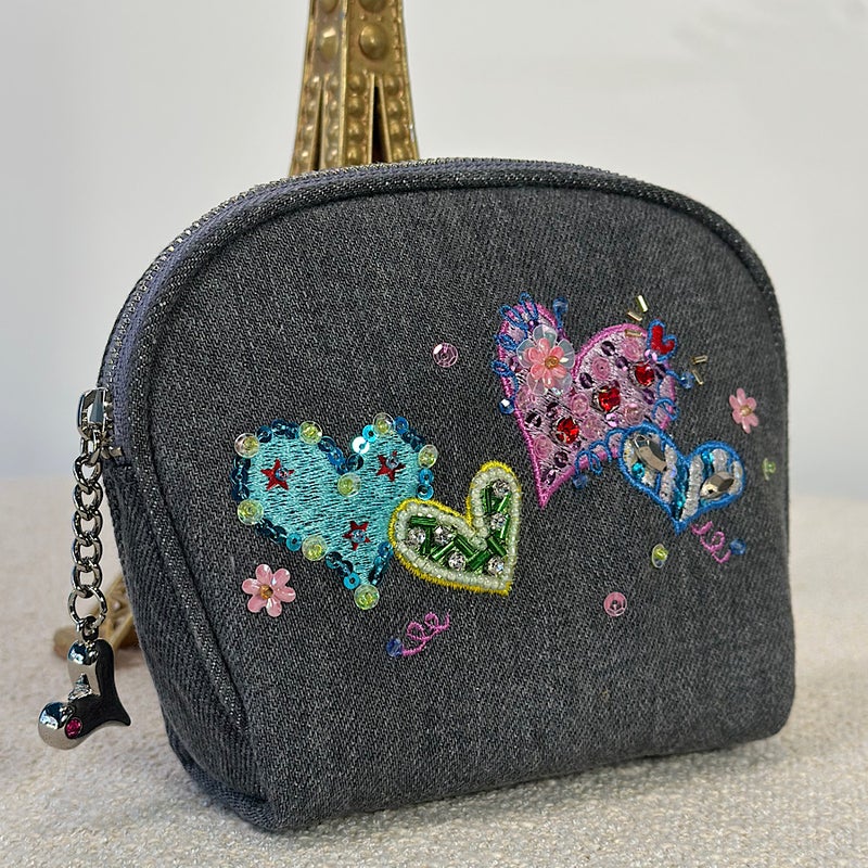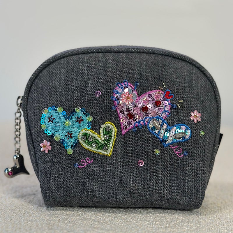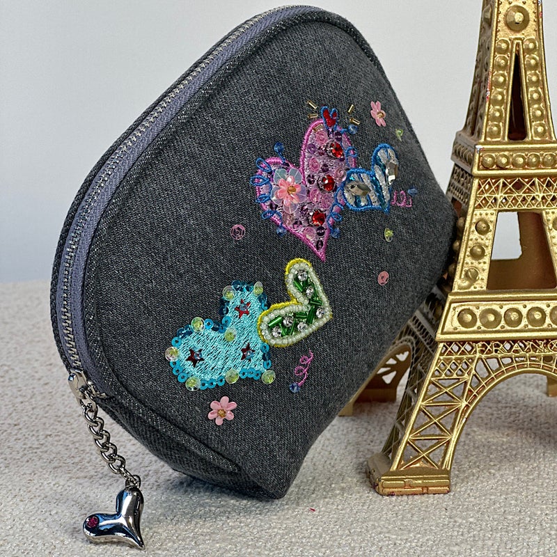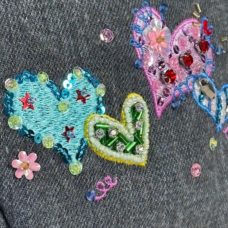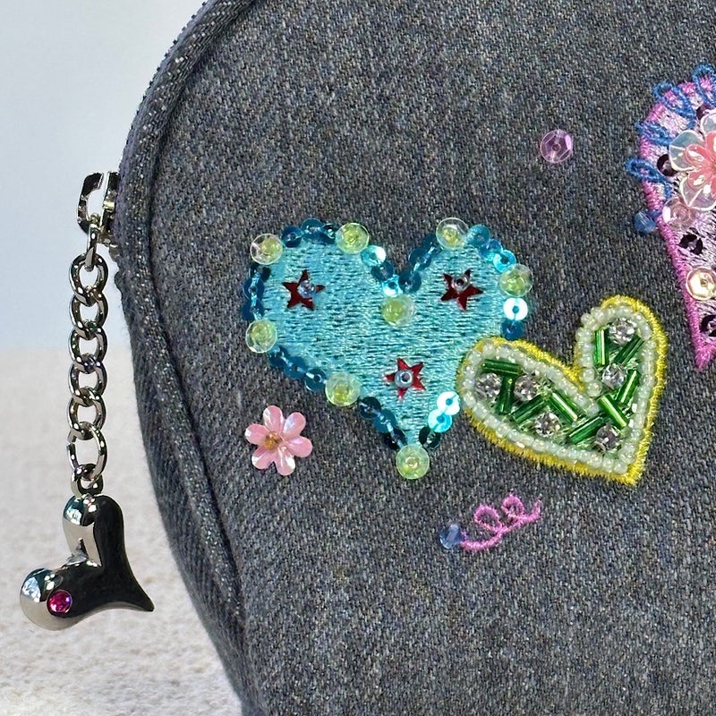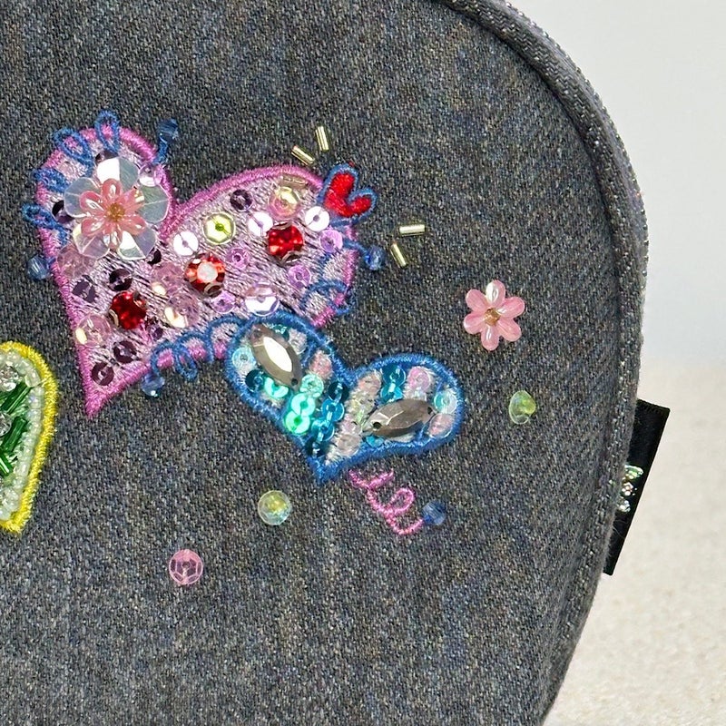 岡山製デニム素材をベースに、ビーズやスパンコール、クリスタルガラスを使った