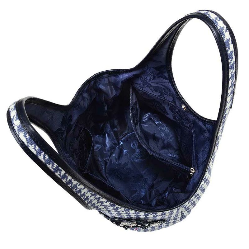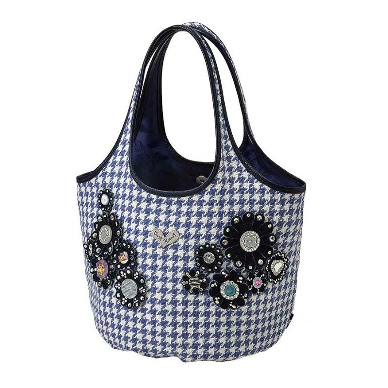 ネイビーの千鳥模様の織生地に合わせたのは、オリジナルデニムをベースに、煌めくオリジナルボタンを花芯に見立て、花びらにも贅沢にクリスタルガラスを散りばめたフラワーモチーフ。